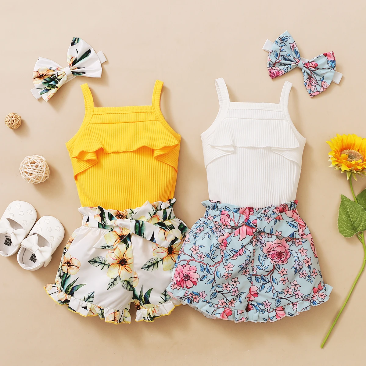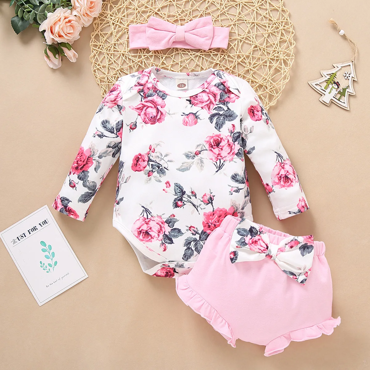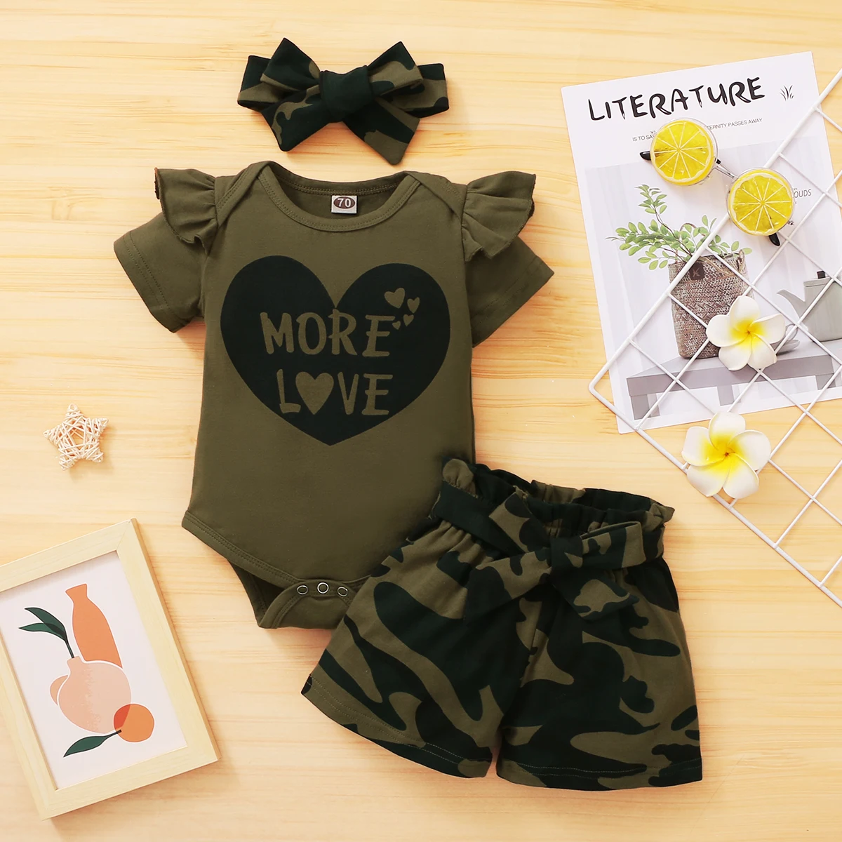 Комплект из 3 предметов, для малышей, для маленьких девочек одежда для детей на лето и весну повседневная одежда из хлопка, комплект одежды, боди с надписью, шорты с бантиком и повязка на голову, одежда для малышей