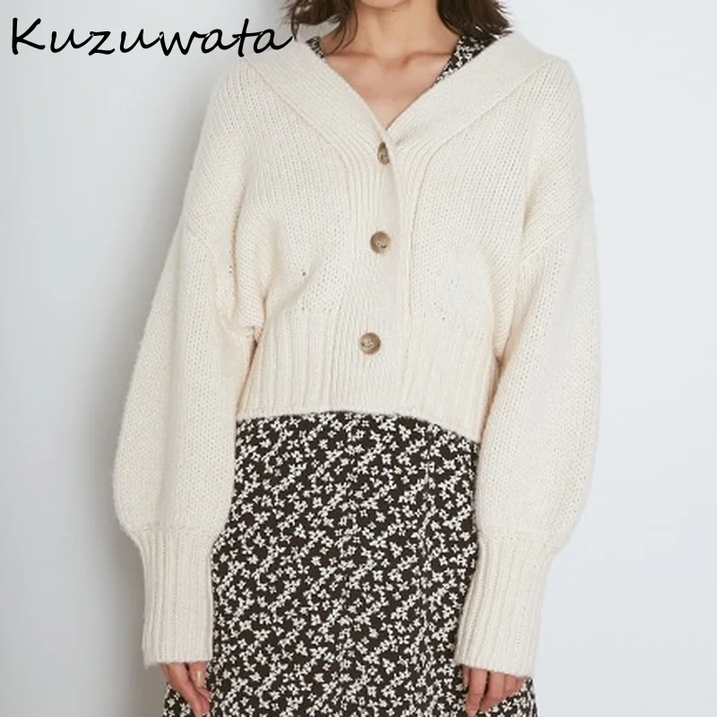 Новый простой милый свободный женский кардиган Kuzuwata, весна 2022, однобортное вязаное пальто с V-образным вырезом, повседневные однотонные дизайнерские свитера