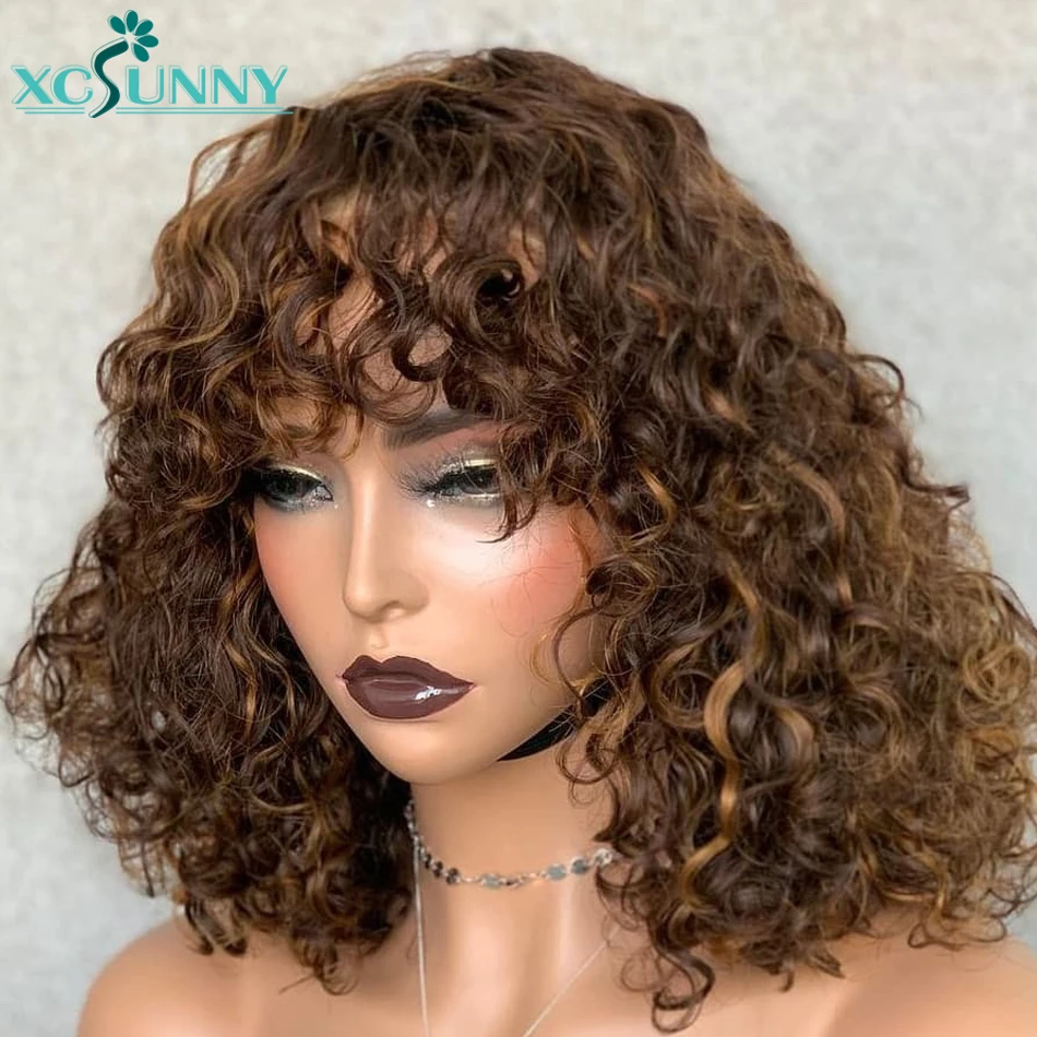 Вьющиеся человеческие волосы парик Парики из натуральных волос с челкой Кудрявый парик из натуральных волос Цвет волос: цвет хайлайтера Плотность волос: 150% 180% 200% Размер Кепки: средний размер по умолчанию (если вам нужна Кепка маленького или большого размера, оставьте нам сообщение) Цвет крышки: средне-коричневый
