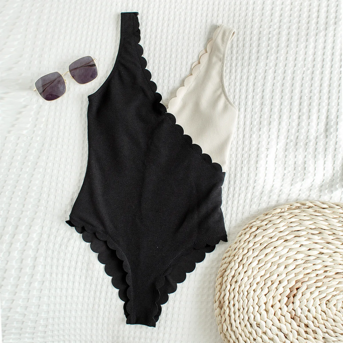 Женский слитный купальник с фестонами, черный и бежевый цвет, купал...
