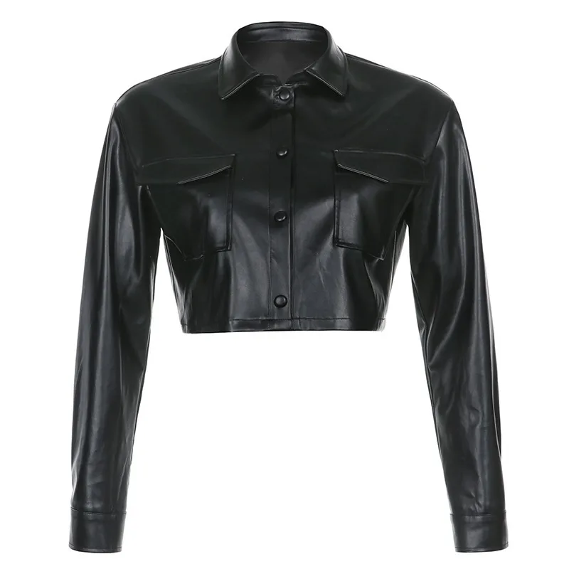 Рубашка женская из экокожи, с отложным воротником и двумя карманами