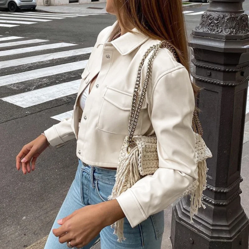 Куртка женская демисезонная из ПУ кожи, с отложным воротником