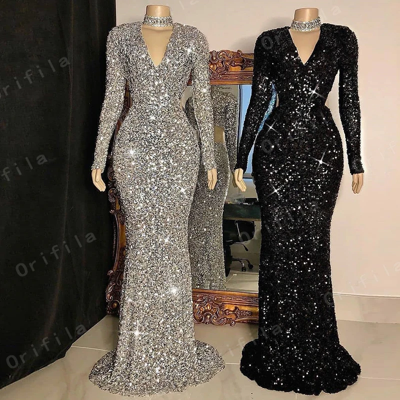 Длинные платья в стиле русалки для выпускного вечера 2021 с V-образным вырезом и длинным рукавом африканские женские черные платья для выпускного вечера для вечеривечерние
