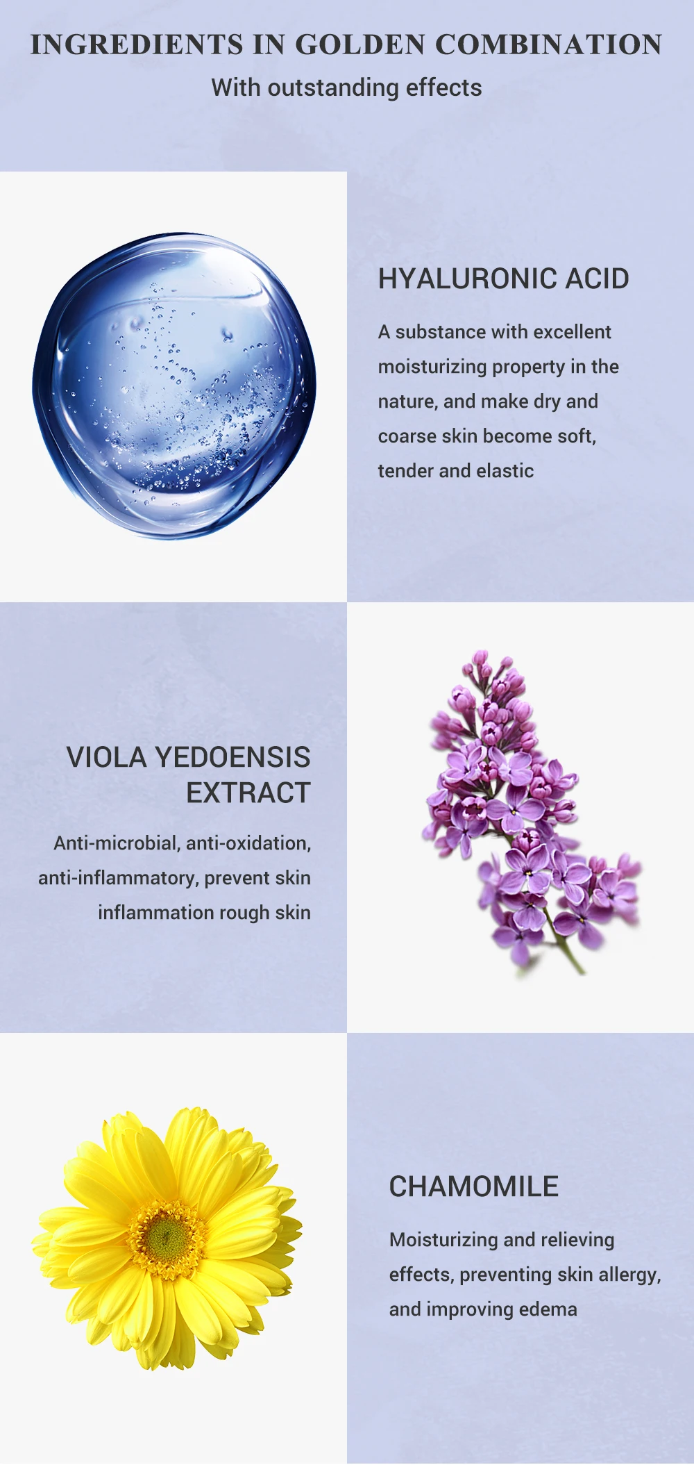 Состав: Аква, глицерин, гиалуронат натрия, экстракт корня паеонии, экстракт Виолы йеденза, экстракт аескулуса шиненза