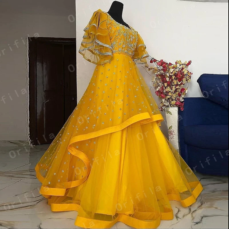Официальные желтые индийские вечерние платья с V-образным вырезом для женщин, кружевные женские платья для помолвки