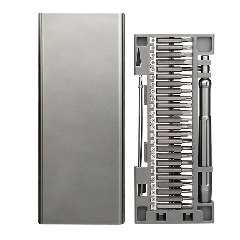 [Многофункциональные Профессиональные отвертки] набор стальных отверток S2 включает 24/48 отверток, которые предназначены для электроники, ноутбуков, телефонов, компьютеров, очков, смартфонов, игрушек, ПК, часов, игровых консолей, камеры, радио и большинство ручных устройств.[Магнитный дизайн] с магнитной конструкцией, что делает его гораздо более простым в использовании. Вам просто нужно выбрать нужный вам бит и положить его в отверстие ручки, и бит будет плотно всасываться из-за магнетизма. Магнитные биты аккуратно внутри ящика для хранения из алюминиевого сплава, даже если головка находится лицом вниз, она не упадет.[Высокая твердость и S2 стальной материал] обновленные магнитные биты изготовлены из высококачественной стали S2, которая намного прочнее и долговечнее, чем сталь CRV. Твердость до 60HRC (допуск: +/- 2HRC), исключительная твердость, превосходная прочность, высокая точность.[Ручка из алюминиевого сплава и конструкция с глубоким отверстием] ручка из алюминиевого сплава с анодным окислением и специальной противоскользящей обработкой, конструкция с поворотным колпачком. Он оснащен отверткой с глубокими отверстиями (12 мм Рабочая глубина), на 30% больше глубины работы, чем обычные отвертки[Ящик для хранения карманного размера] ящик для хранения из алюминиевого сплава имеет тонкий и компактный размер корпуса, гладкий край дуги, чтобы обеспечить вам комфортное сцепление. Пескоструйная обработка Анодирование поверхности обработки, защита от пота и коррозии. Когда вы нажимаете кнопку сверху, внутренняя коробка исчезнет.СпецификацияРабочая глубина бит: 9 ммВес: 249 г/278 гЦвет: серыйМатериал: стальРазмер: 165*67 ммПосылка:1x48 отверток1 отвертка1 x ESD пинцетПримечаниеРазмер бит должен соответствовать размеру винта, в противном случае бит будет скручен или поврежден.Это нормально, если некоторые железные нити появляются в процессе использования, что не влияет на качество и твердость продукта, не волнуйтесь.Только вышеуказанная посылка, другие товары не включены.Примечание: светильник и различные дисплеи могут привести к тому, что цвет товара на картинке немного отличается от реального. Допускается погрешность в измерениях +/- 1-3 см.