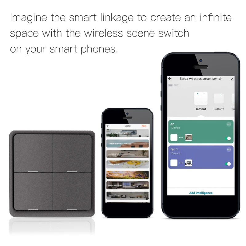 2. Три режима сопряжения для каждой кнопки для получения 12 сцен из одного переключателя 4 групп, таких как режим «вдали», домашний режим, режим фильма и т. д. Чтобы создать любую интеллектуальную автоматизацию в вашем приложении для смартфона, чтобы начать другой Интеллектуальный образ жизни, больше не нужно голосовых команд, больше нет времени на открытие приложения, требуется только одно касание, когда вы устали от однодневной работы.