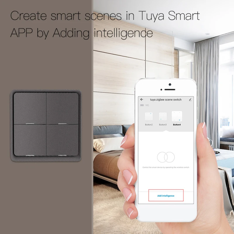 1. Умная Автоматизация беспроводного переключателя сцены Tuya ZigBee на любые умные устройства tuya в приложении Smart Life, чтобы установить различные сцены для вашей умной жизни. Нажмите «бежать», чтобы получить еще одно упрощенное управление всеми умными устройствами tuya с помощью одной кнопки на переключателе. Каждая кнопка переключения может удовлетворить различные потребности, Реализация различных сцен. Представьте умную связь для создания бесконечного пространства с переключателем проводной сцены.