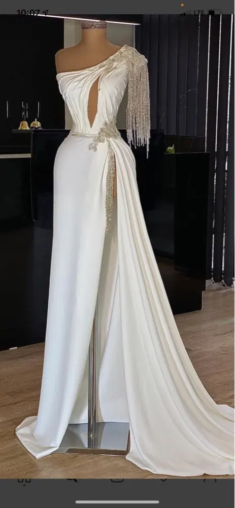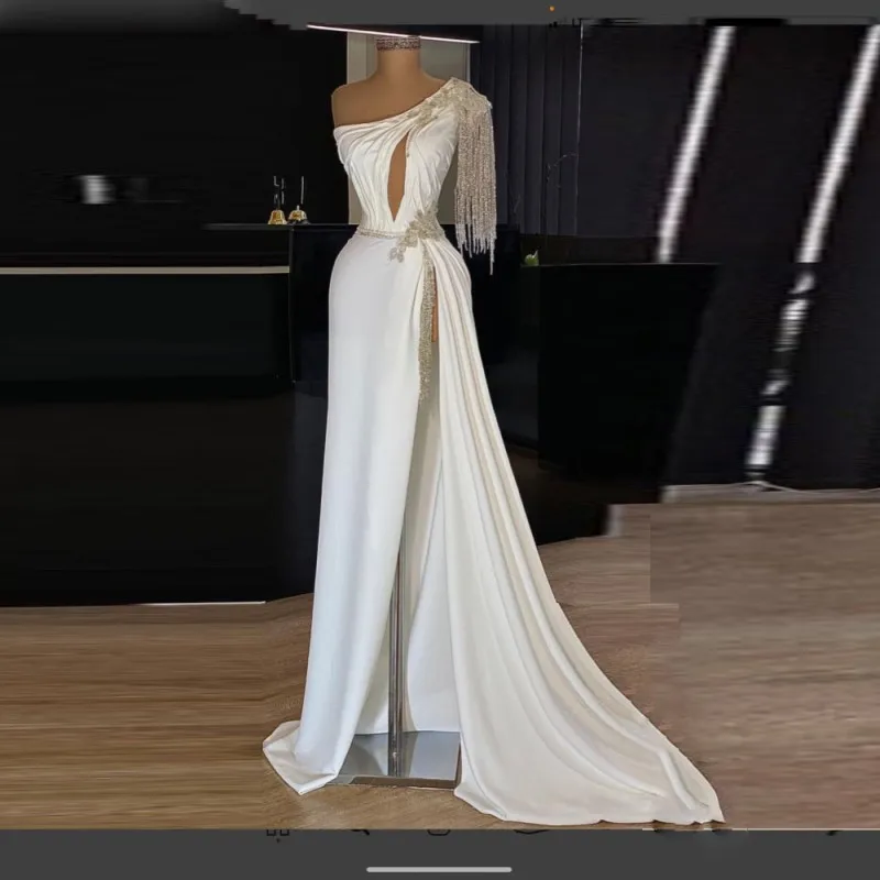 Женское вечернее платье со шлейфом, элегантное белое платье на одно плечо с бахромой и высоким разрезом сбоку, сексуальное платье для выпускного вечера