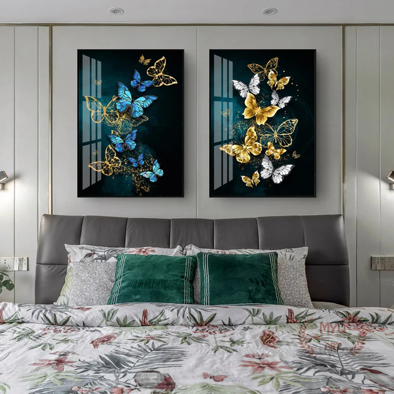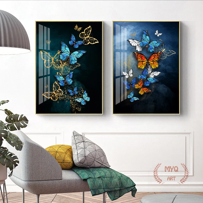 Современный минималистичный плакат с изображением синей золотой бабочки на холсте, настенная Картина на холсте, настенное украшение для гостиной, домашний декор