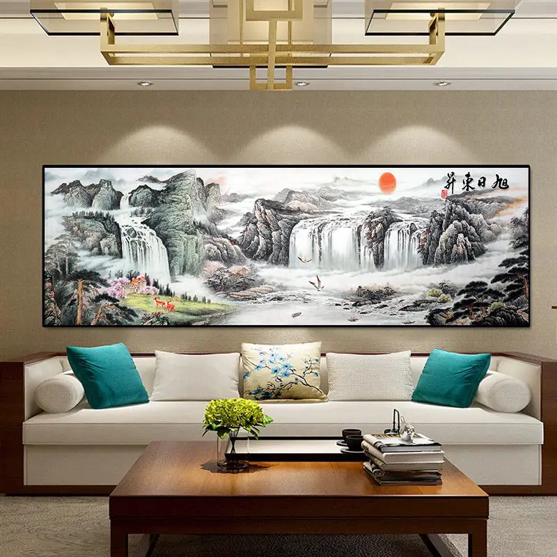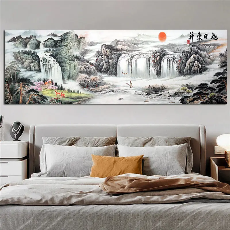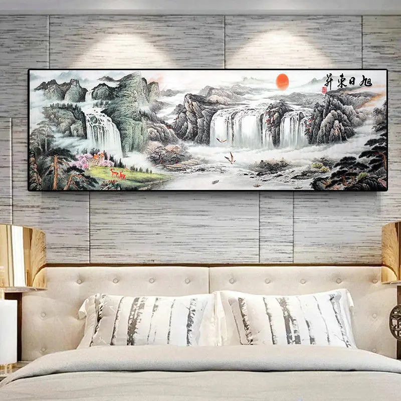 Картина в китайском стиле, восходящее солнце, водопад, Настенная картина без рамы
