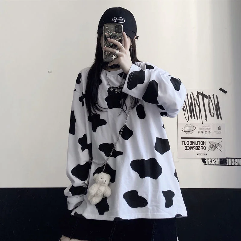 Женские футболки, осенняя футболка с принтом в стиле японской уличной Лолиты, коровы, свободная футболка с длинным рукавом, Топ для женщин, женские футболки