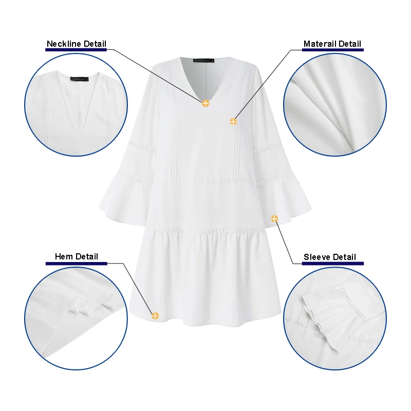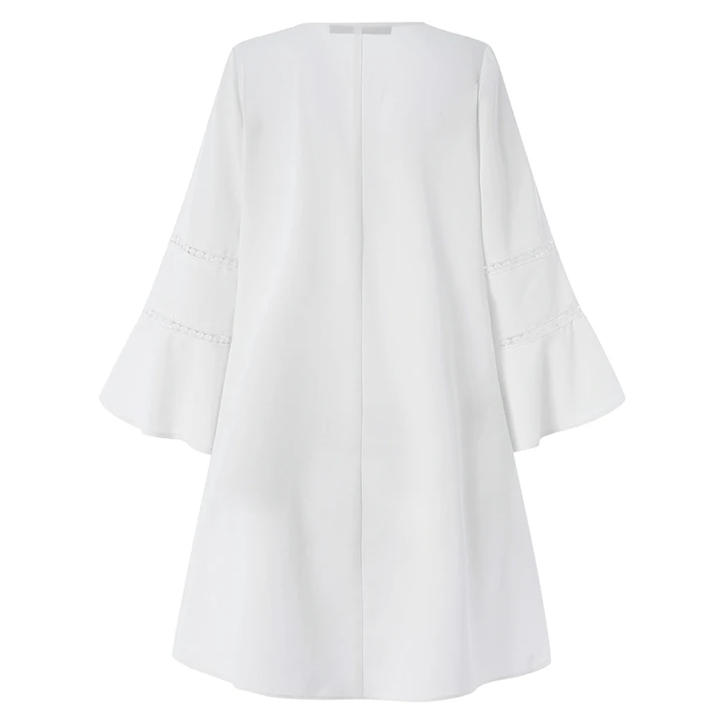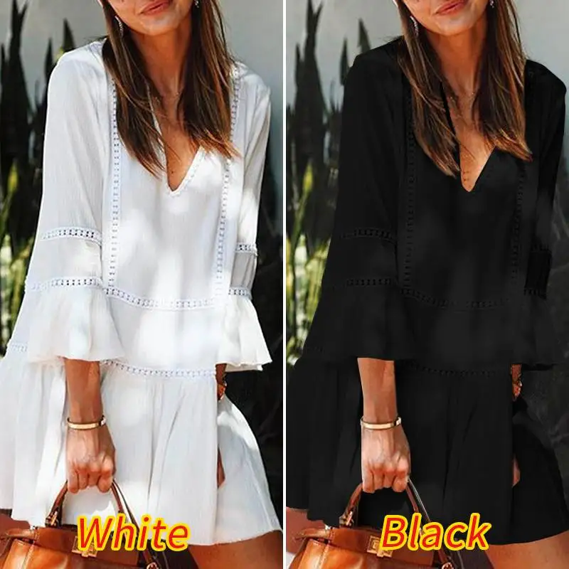 Посылка входит: 1 платьеМатериал: 100% полиэстерЦвета: черный, белыйРазмер: S,M,L,XL,2XL ,,,Длина рукава: рукав три четвертиВырез горловины: v-образный вырезРисунок: однотонный, кружевной патчхлорДлина: выше коленаТолщина: тонкаяУкрашение: кружевоОсобенности: расклешенный рукав, ажурный дизайнСтиль: Досуг, богемный, ретро, Европа, многослойное платье, свободное, литературноеСезон: весна, лето, осень, зимаПовод: семья вечерние, свадьба, праздник, работа, повседневный