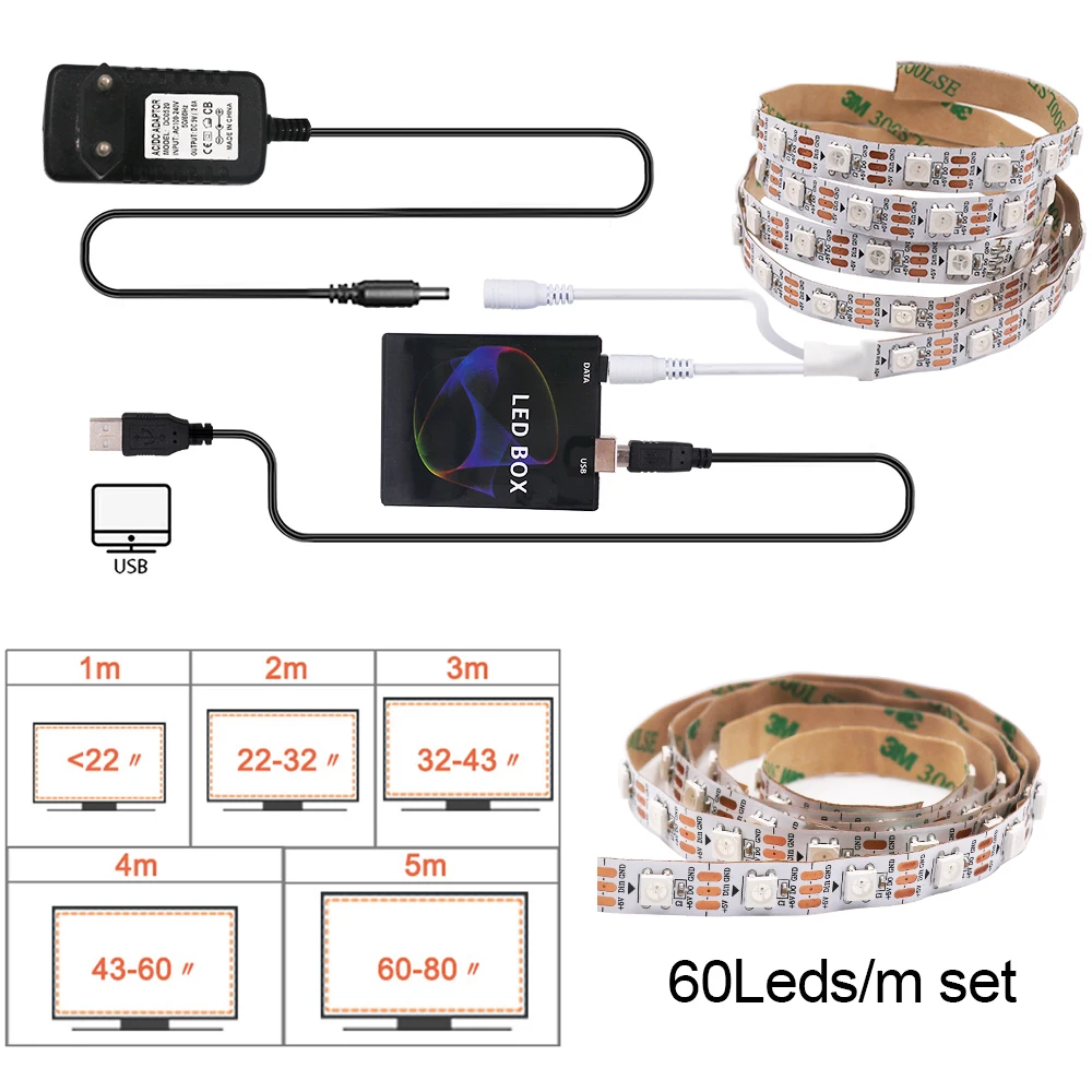 WS2812B цветных (RGB) светодиодных лент: 5V USB DIY ТВ HD ТВ компьютерный монитор Подсветка IP65 Водонепроницаемый + окружающей среды контроллер + ЕС и США Питание