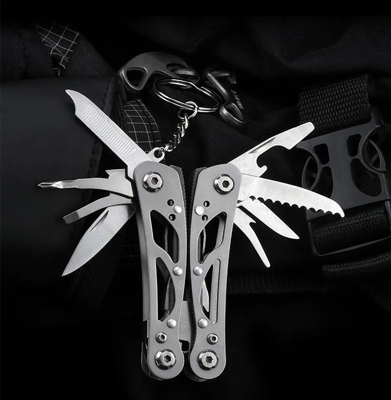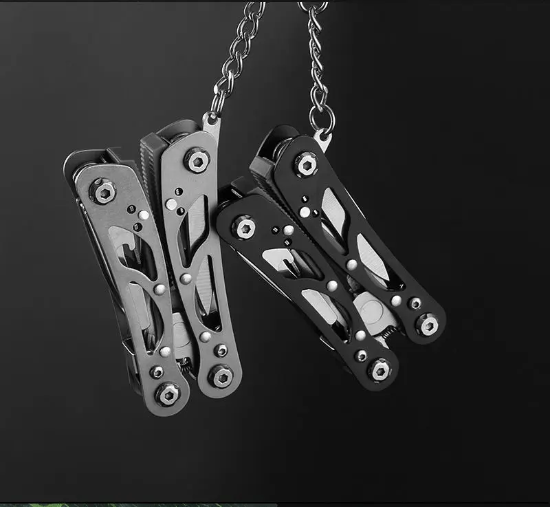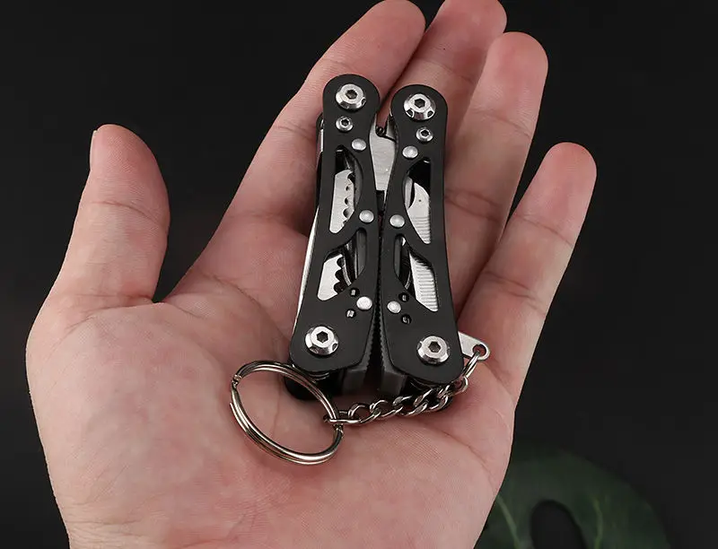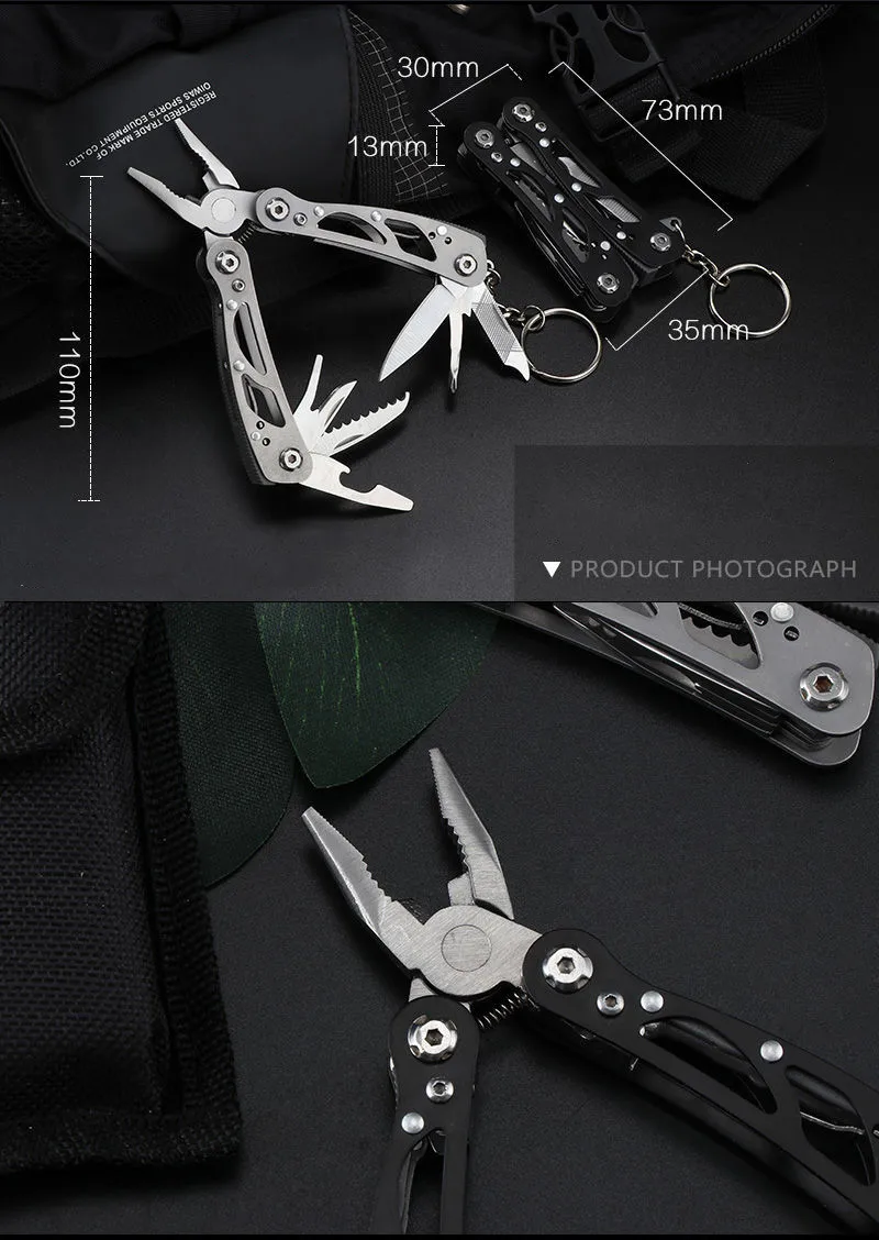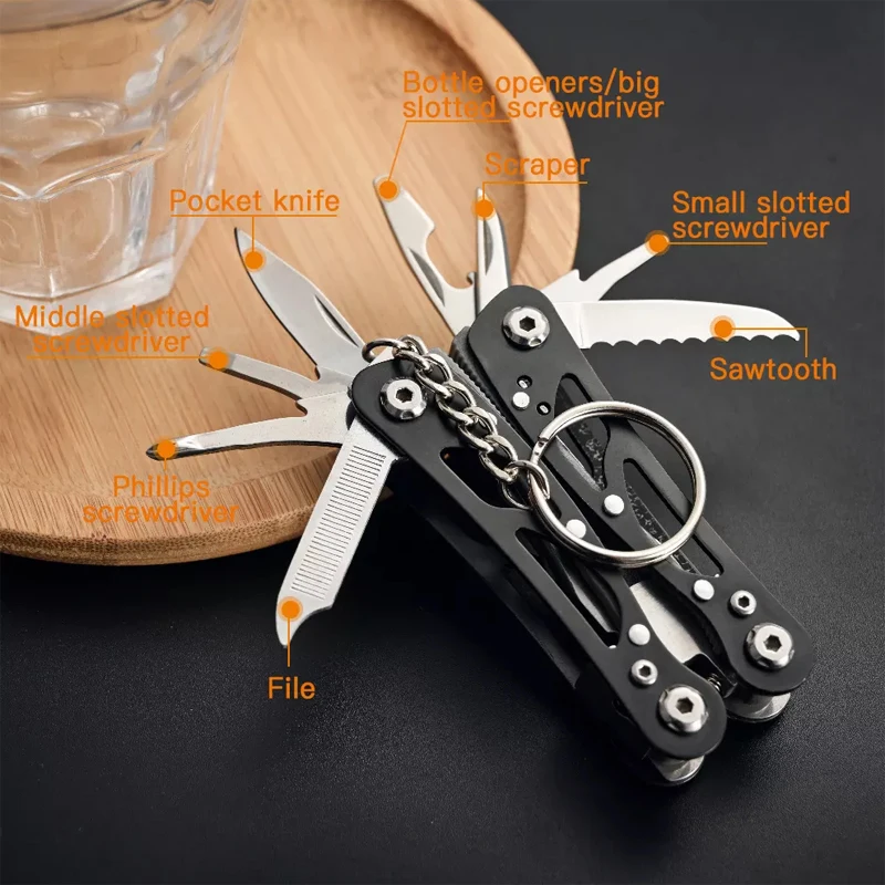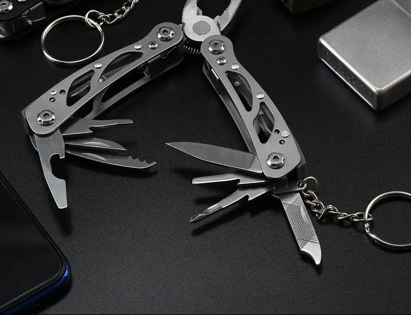 Тактические плоскогубцы 13 в 1 оснащены игольчатыми плоскогубцами, обычными плоскогубцами, кусачками, ножом, средней плоской отверткой, скрещенной отверткой, двухсторонним полировщиком, открывалкой для бутылок (с большой плоской отверткой), мини-Лопатка, мини-плоская отвертка, стоматологический нож (для удаления рыбьей чешуи) и функция брелока. Это может эффективно помочь вам решить различные проблемы на открытом воздухе.