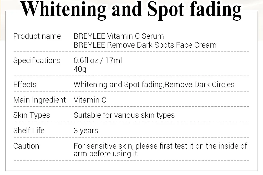 Отбеливание и выцветание пятен Название продукта: Сыворотка витамина С BREYLEE Крем для лица BREYLEE для удаления темных пятен Характеристики: 17 мл/Сыворотка 40 г/Крем для лица Эффекты: отбеливание и выцветание пятен, удаление темных кругов Основные ингредиенты: Витамин С Типы кожи: подходит для различных типов кожи Срок годности: 3 года Внимание: для чувствительной кожи, пожалуйста, сначала проверьте его на внутренней стороне руки перед использованием