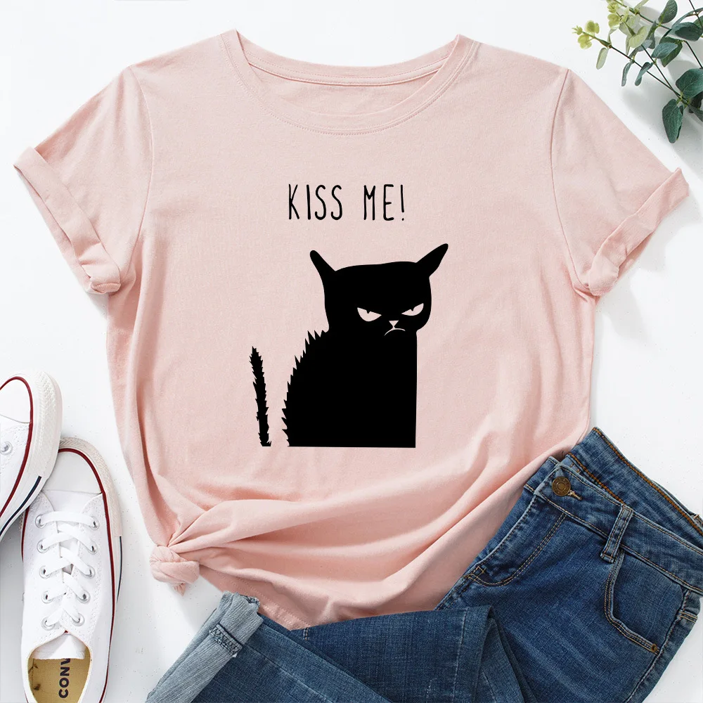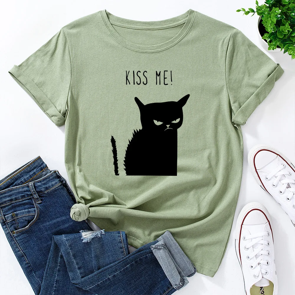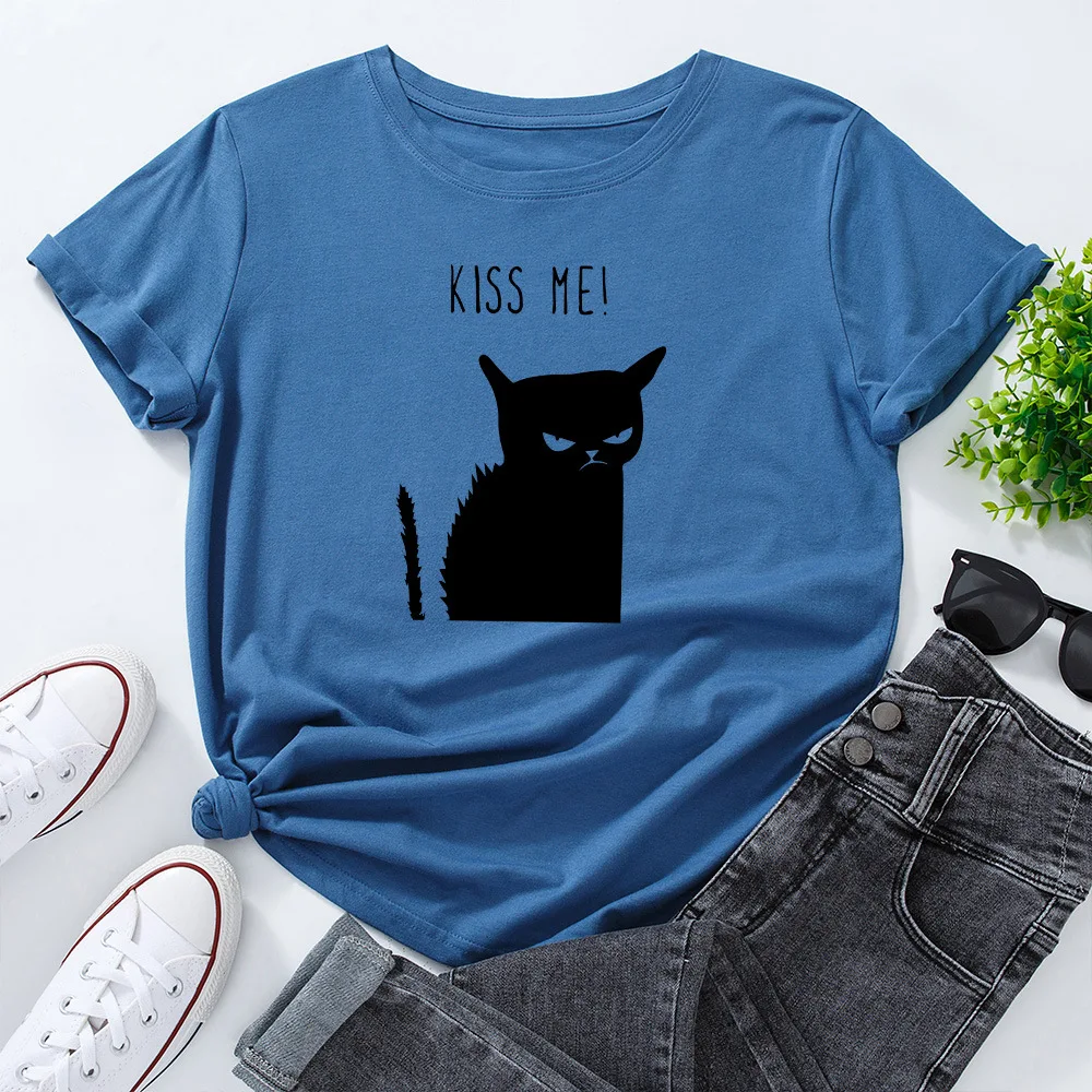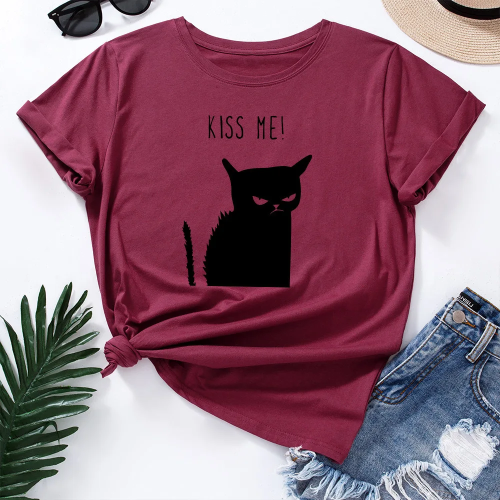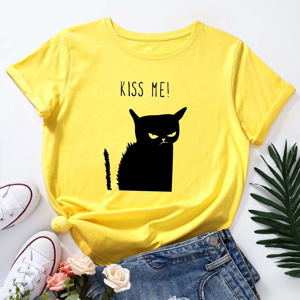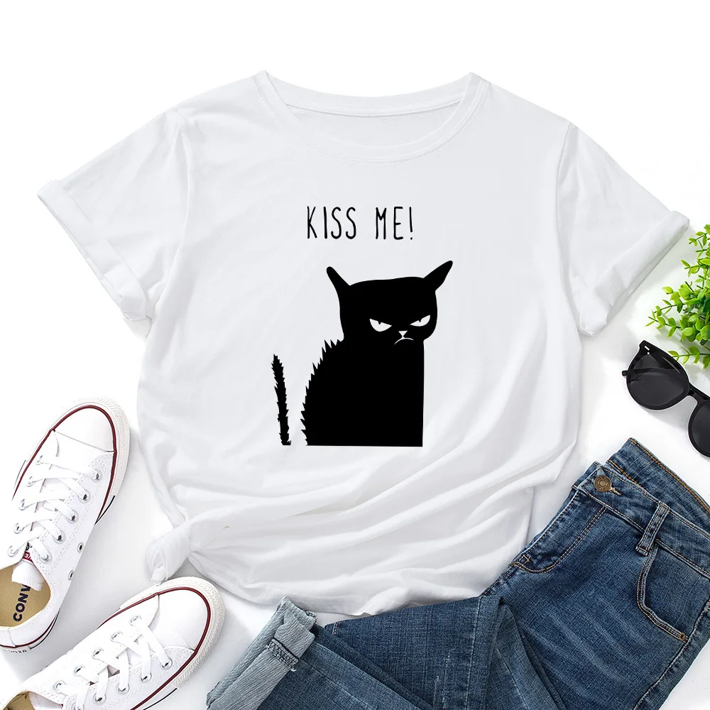 Женская футболка с принтом в виде кота, летняя футболка из 2021 хлопка с круглым вырезом и короткими рукавами, 100%