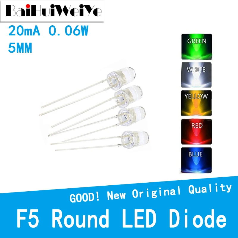 Ультраяркий прозрачный светодиодный Диод, 100 шт.лот, красныйзеленыйсинийбелыйжелтый, 5 мм, Круглый диод F5 20 (мА) 0,06 (Вт) 3-3,3 В