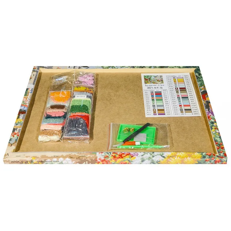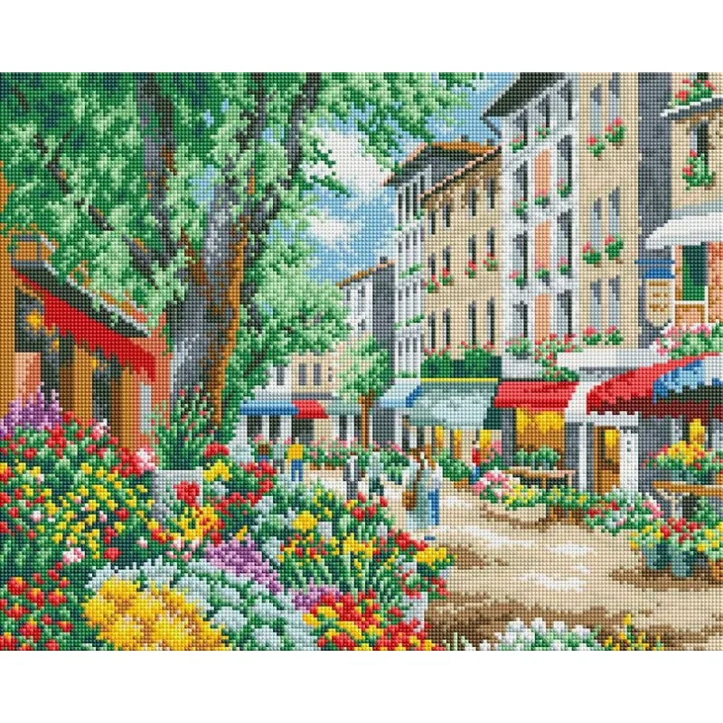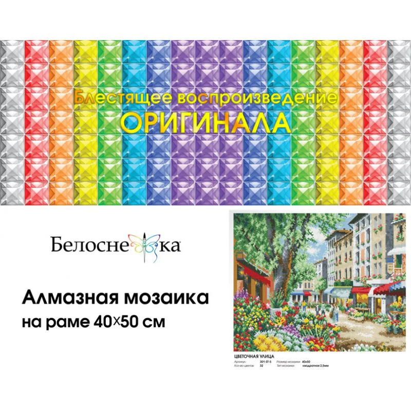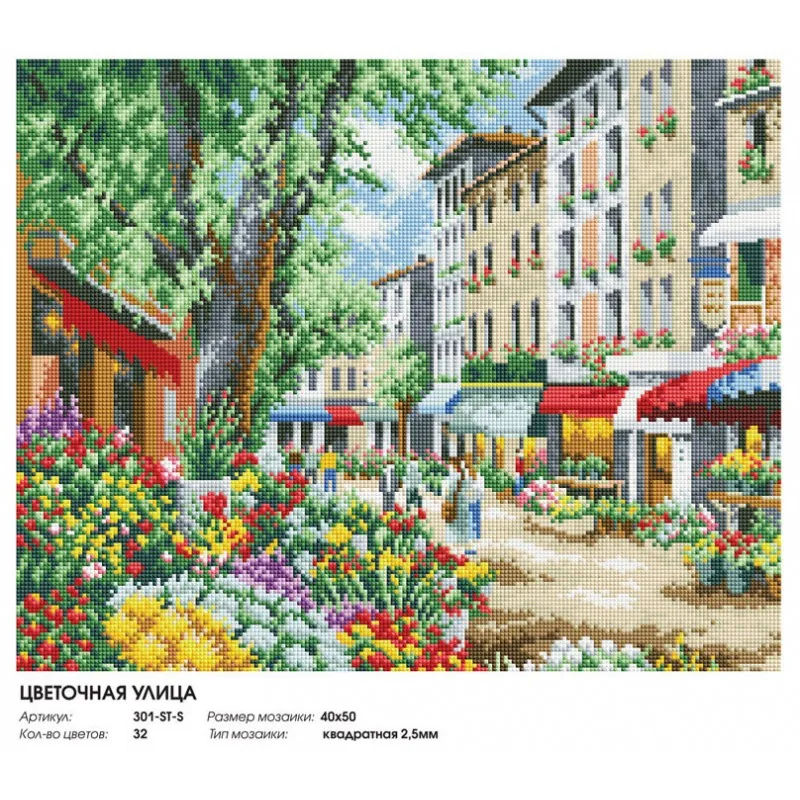 Алмазная мозаика - Цветочная улицаСоздайте свой рукотворный шедевр с помощью набора для творчества “Мозаичная картина”. Канва с нанесенной схемой покрыта высококачественным клеевым слоем, на которую с помощью пинцета размещайте маленькие искусственные камушки с алмазными гранями на рисунок. Камушки выполнены из современного композитного материала, устойчивого к воздействию солнечных лучей. Камушек за камушком и канва будет закрываться блестящим и переливающимся панцирем. Готовая картина, сделанная своими руками, станет прекрасным украшением вашего дома или подарком близким и друзьям. Выкладка картин алмазной мозаики - это ещё и отличный способ для расслабления и релаксации после работы. Вы наслаждаетесь творческим процессом и отдыхаете. Это как вышивание, только проще и красивее!