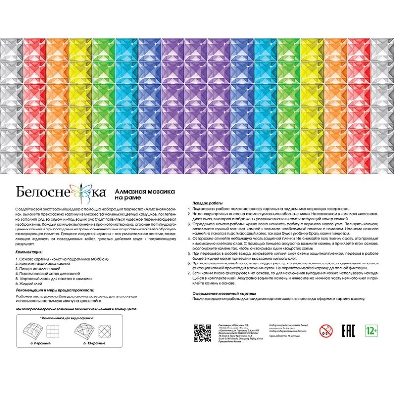 Характеристики:Тип выкладки – 100% заполнениеФорма камней - квадратные 2,5*2,5 мм, 9 и 13 гранейРазмер – 40*50 см.Серия - пейзажКоличество цветов - 32Упаковка – картонная коробкаТорговая марка – БелоснежкаСтрана производства - Китай