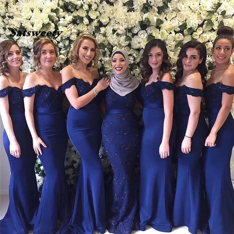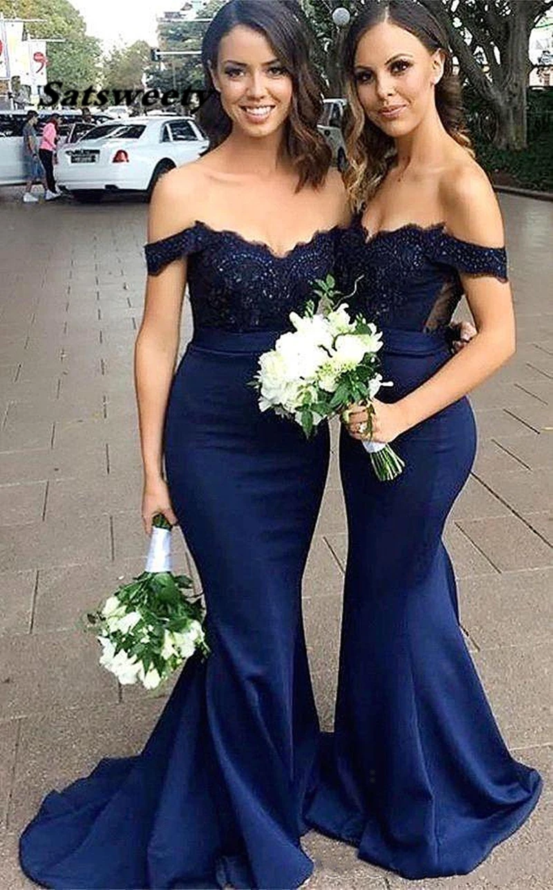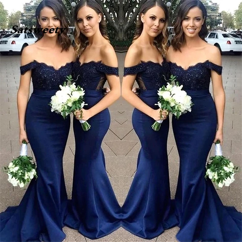 Темно-синие платья подружки невесты с юбкой-годе, шифоновые атласные садовые платья с открытыми плечами для гостей свадьбы и вечеривечерние, платья в стиле бохо для подружки невесты, платья для выпускного вечера