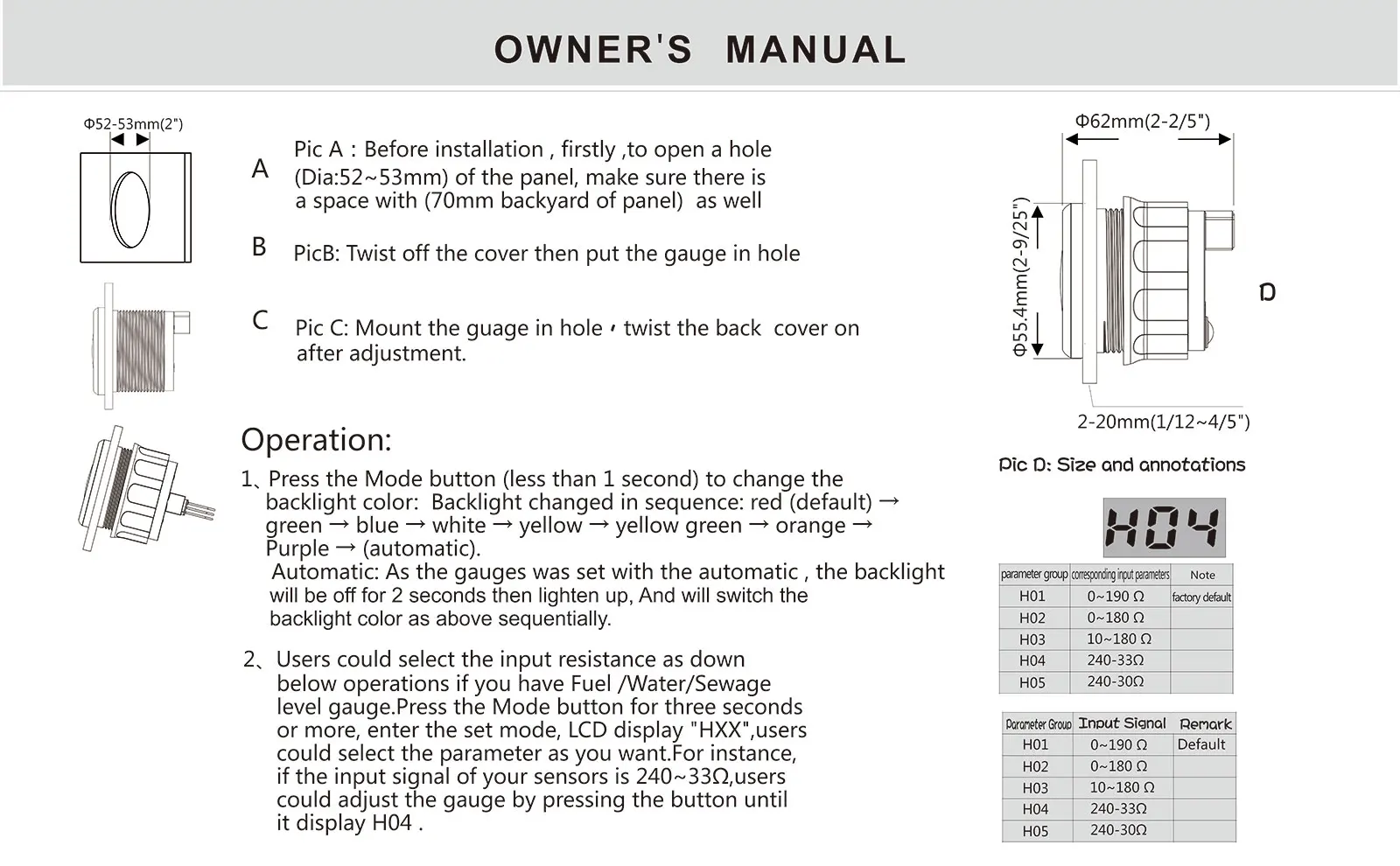 Датчик уровня топлива, водонепроницаемый, 52 мм, с подсветкой 8 цветов, для автомобилей, лодок, грузовиков, автофургонов, 0 190 Ом