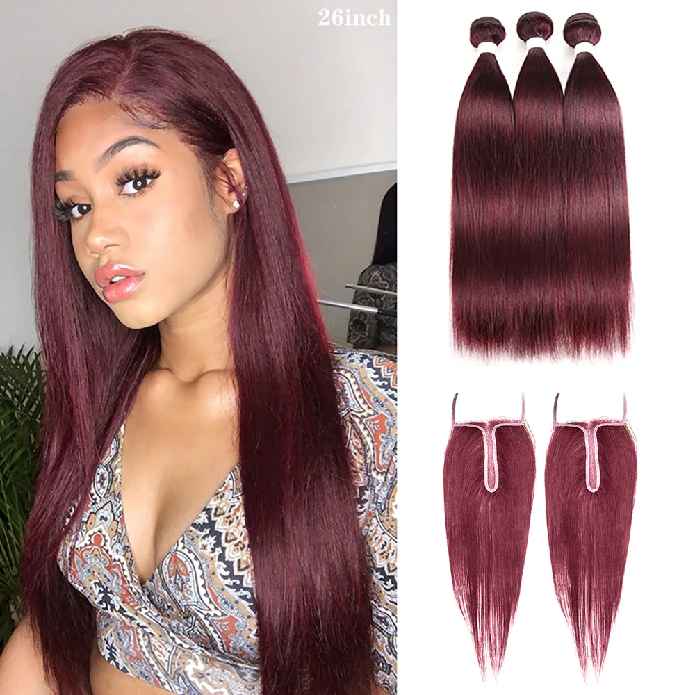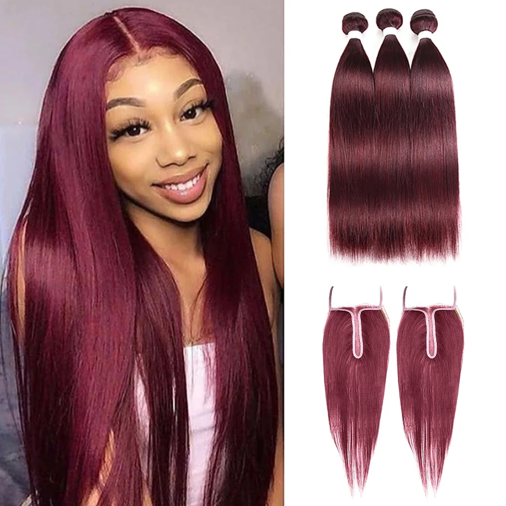 99J Red PreColored пучки прямых и волнистых волос с кружевной застежкой 4x1 бразильские человеческие волосы для наращивания 99J #2 #4 светильник-коричневые Реми