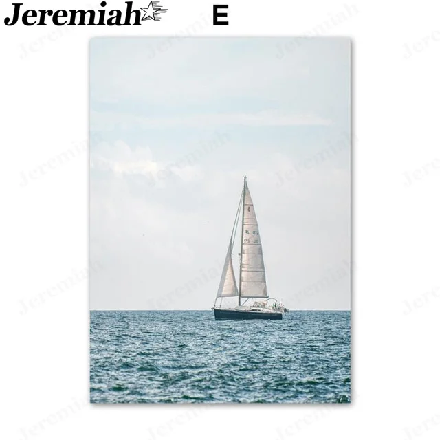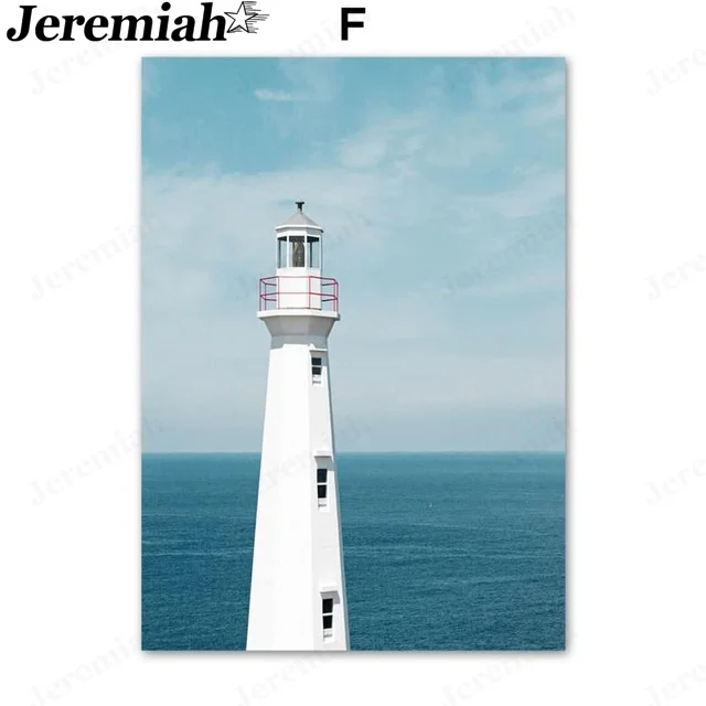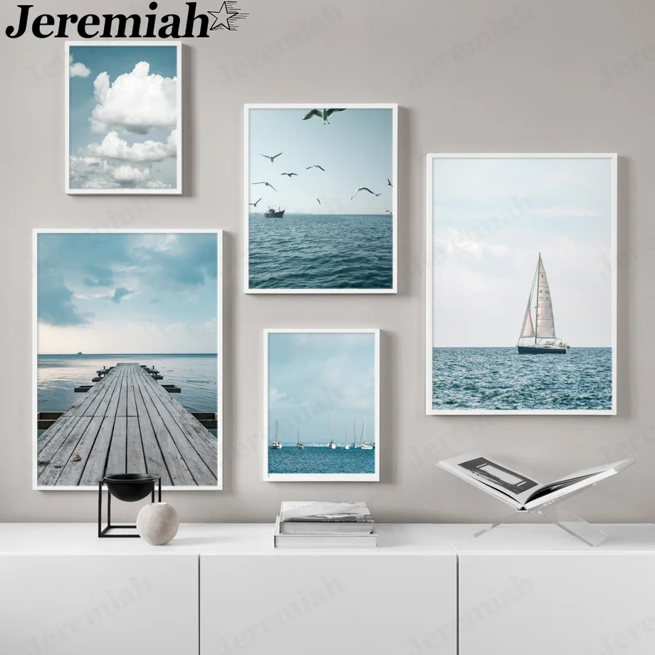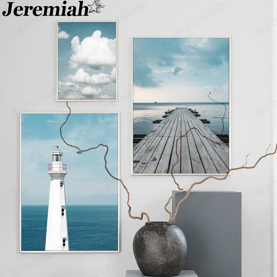 Постер на холсте в скандинавском стиле с изображением синего неба, пейзажа, лодки, маяков, настенное искусство, современное эстетическое украшение для дома, аксессуары