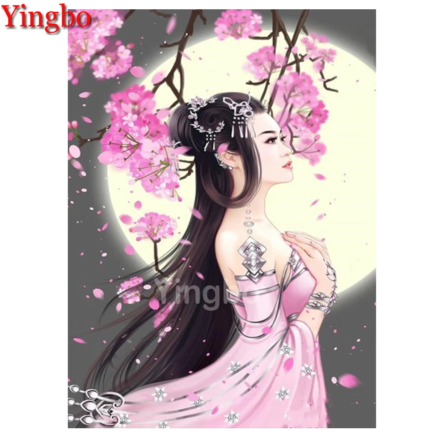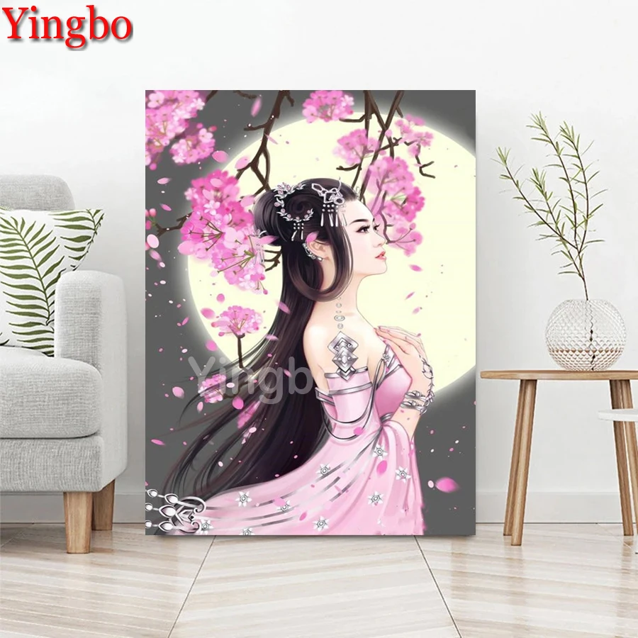 5D алмазная живопись сделай сам, Классическая восточная красота, цветок вишни, Луна, вышивка крестиком, полноразмернаякруглая Алмазная мозаика, вышивка
