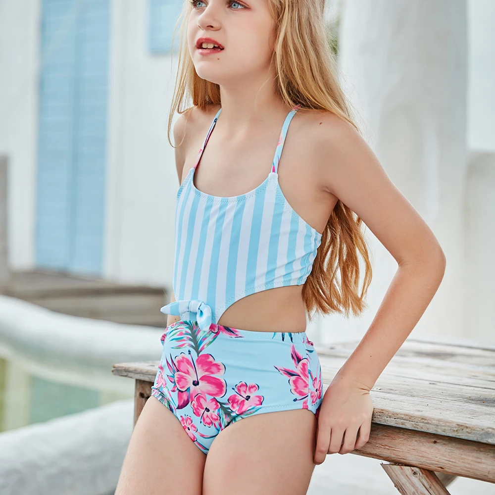 Детский слитный купальник, бикини в полоску, с винтажным принтом, для девочек, пляжная одежда, 2021