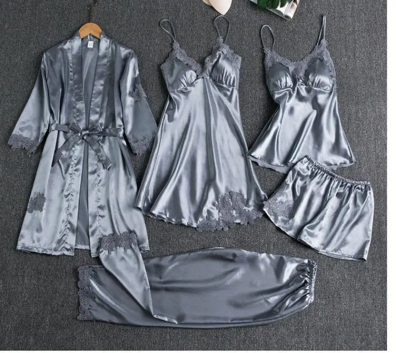 5 шт., одежда для сна, Женский пижамный комплект, атласная пижама, кружево, пэчворк, свадебная одежда для сна, искусственный шелк, домашняя одежда, ночная рубашка и халат, костюм