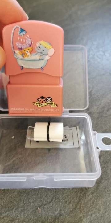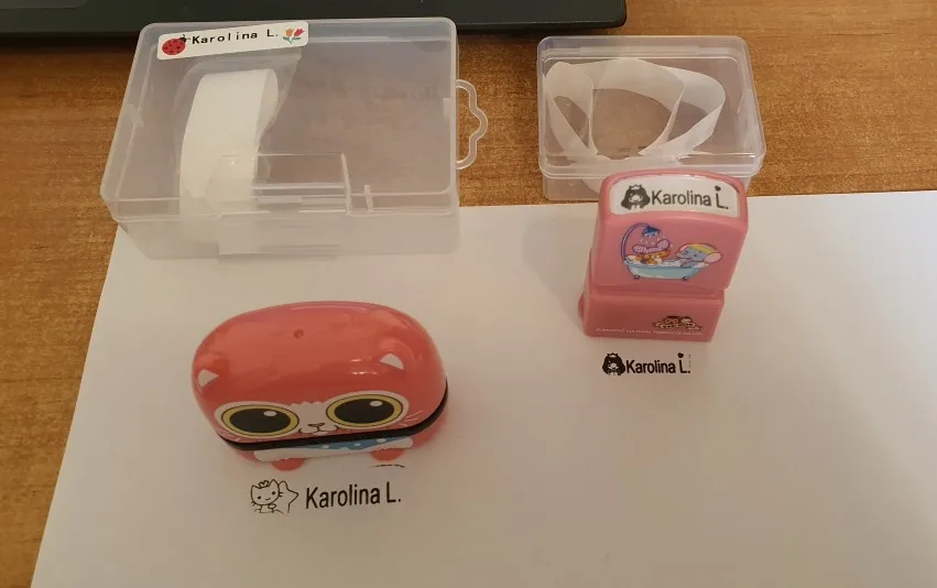 o formato é muito fofo e lindinho mesmo, vem em uma caixa transparente e a tampa fixa bem, fácil de tirar e colocar. Não vem recarga de carimbo. O nome veio errado e solicitei reembolso e fui atendida. Quando fecharem o pedido confirmem com o lojista que é muito atencioso se o nome está correto.
