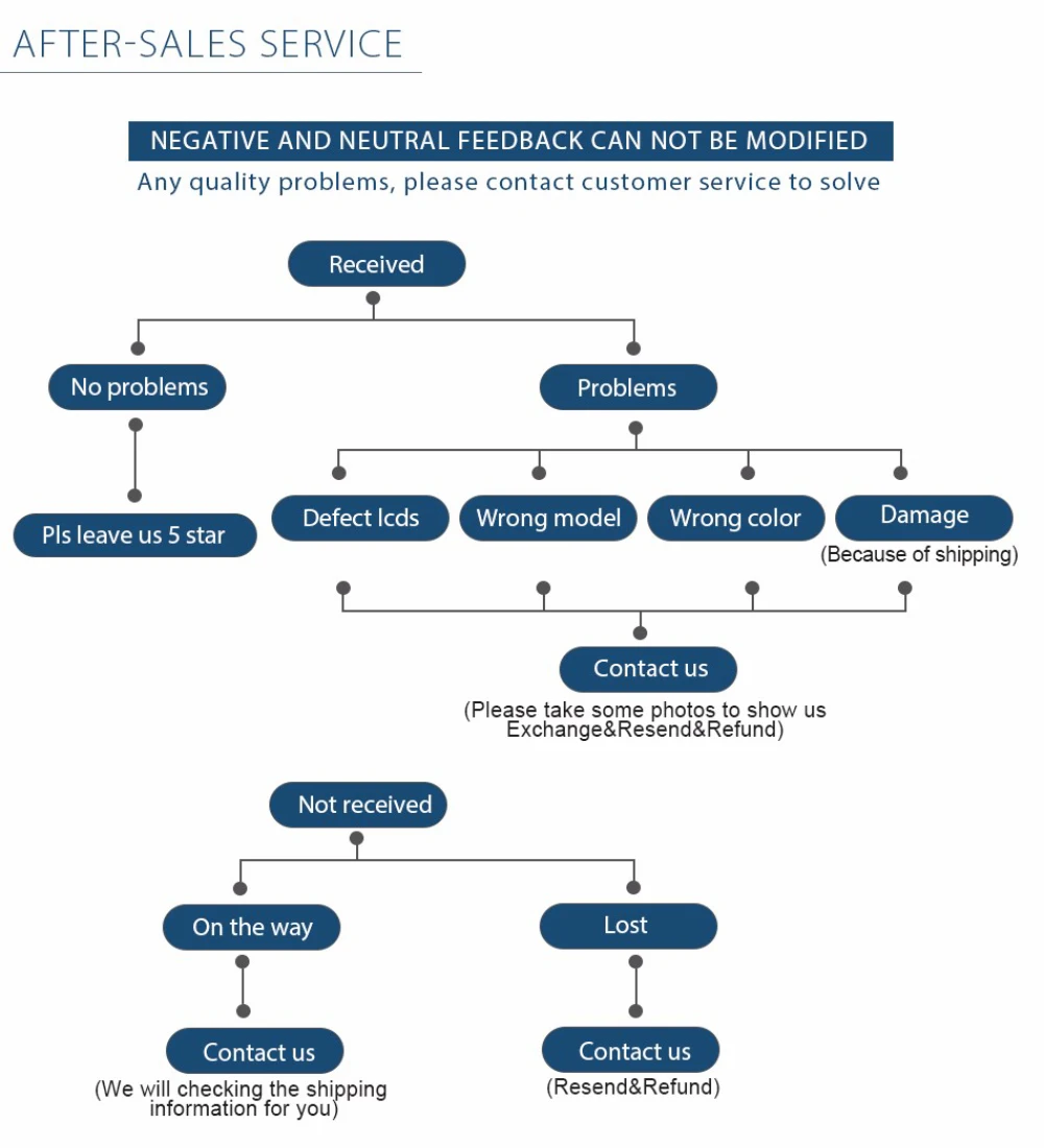 Примечание: нужно видео и фотографии1. Когда вы получите посылка с повреждением, пожалуйста, не подписывайте EXPRESS. И посылка будет возвращена.2. Когда вы обнаружите, что это дефектный экран для ЖК-дисплея iPhone x перед установкой. 3. Если вы получили неправильный цвет или модель сенсорного ЖК-экрана.3. Если вы не получили посылка. Мы предоставляем услуги по замене, если есть какие-либо проблемы с качеством, но Дисплей для iPhone x lcd должен соответствовать следующим требованиям: A. ЖК-дисплей для iPhone X имеет логотип. B. ЖК-дисплей в гарантийный срок. C. ЖК-дисплей не поврежден человеком. Примечание: если сенсорный ЖК-экран имеет проблемы с человеком, гарантия отсутствует.