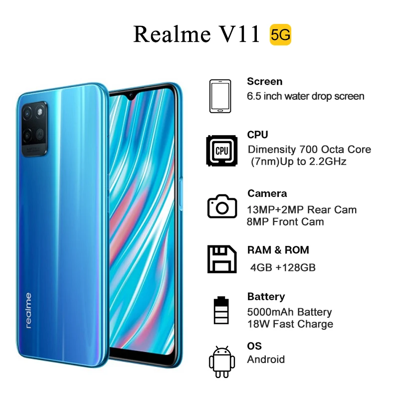 Realme V11 5G мобильных телефонов 6,5 ''amoled полноэкранный Dimensity 700 Octa Core 13MP двойной камеры 18 Вт Быстрая зарядка 4 Гб 128 Гб мобильный телефон