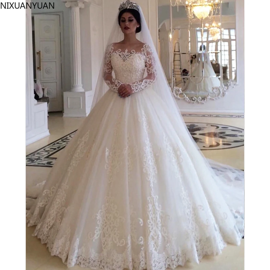 Элегантное бальное платье принцессы Свадебное платье с длинными рукавами с кружевной аппликацией; Свадебные платья из фатина 2021 Vestido De Noiva