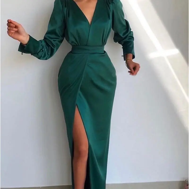 Женское вечернее платье с длинным рукавом, темно-зеленое атласное платье с разрезом и юбкой-годе, платье для выпускного вечера, платье для официальной вечеринки в арабском Дубае, 2021