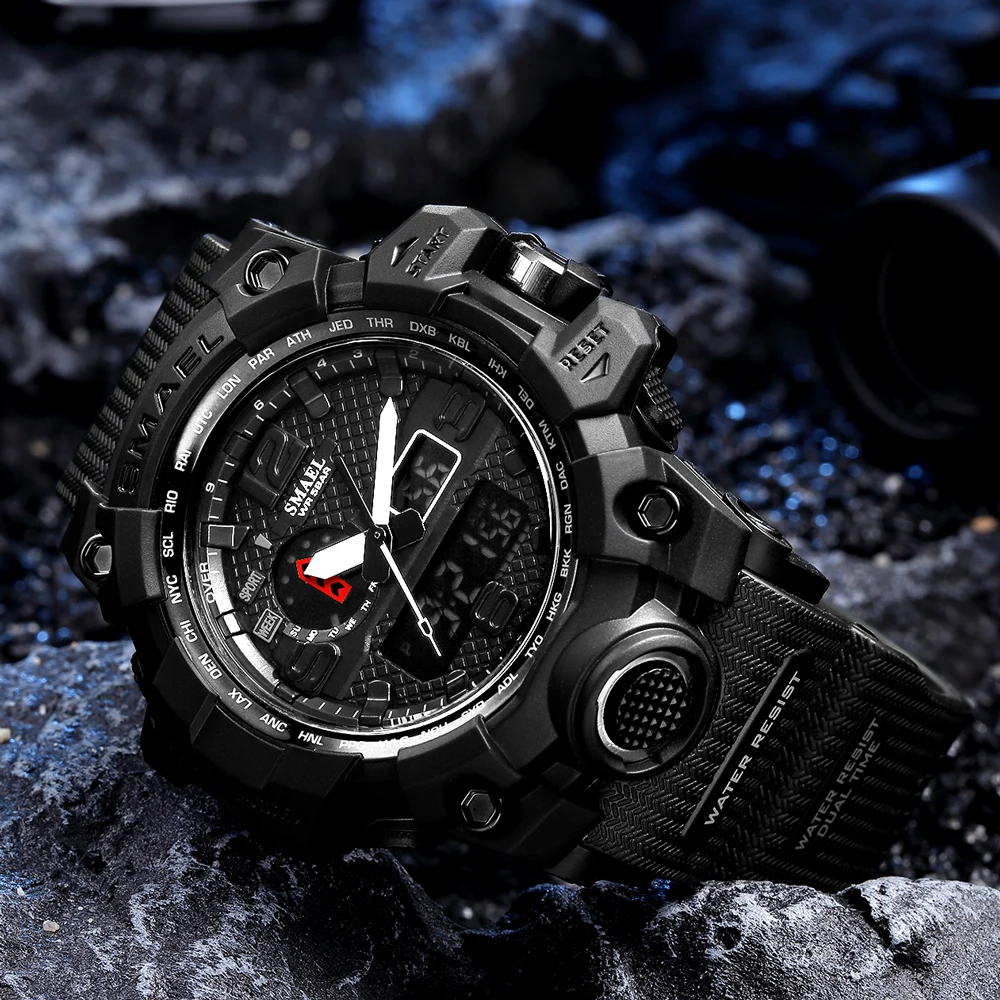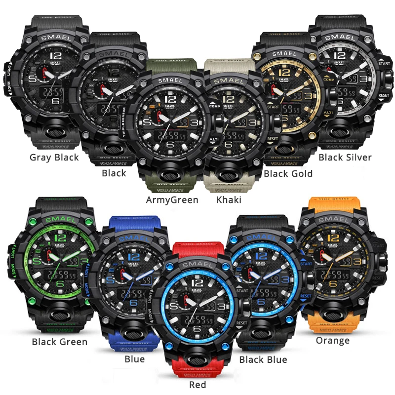 Описание товара: 1. Бренд: SMAEL 2. Двойное время показывается с светодиодный цией светодиодной подсветки 3. Водонепроницаемость 50 м 4. Тип: мужские спортивные часы 5. Механизм: японский оригинальный цифровой механизм 6. На выбор 16 цветов 8. Ширина ремешка: (прибл.) 2,1 см 9. Диаметр циферблата: (приблизительно) 4,8 см 10. Материал ремешка: прочный полиуретан 11. Материал корпуса: прочная резина + Высокопрочное закаленное стекло 12. Застежка: Пряжка 13. Показывает точное время 14. Это хороший подарок для кого-то особенного Примечание: Мы рекомендуем не носить его во время плавания. Но если вы плаваете или ныряете, пожалуйста, не нажимайте никаких кнопок под водой! Компоненты в комплекте: -1 х Оригинальные часы SMAEL -1 x Руководство по использованию