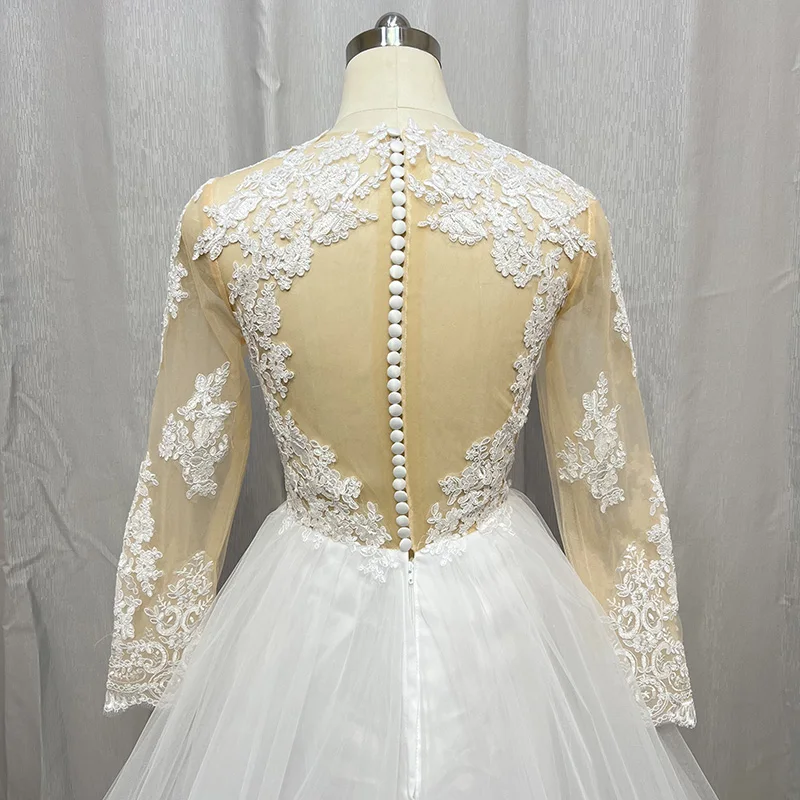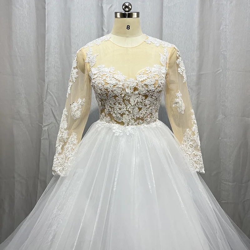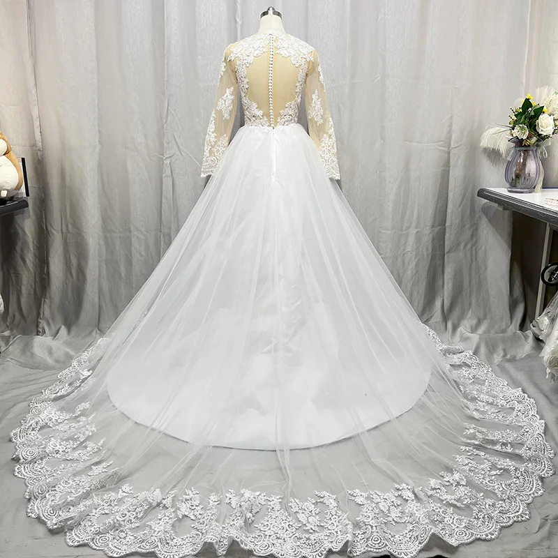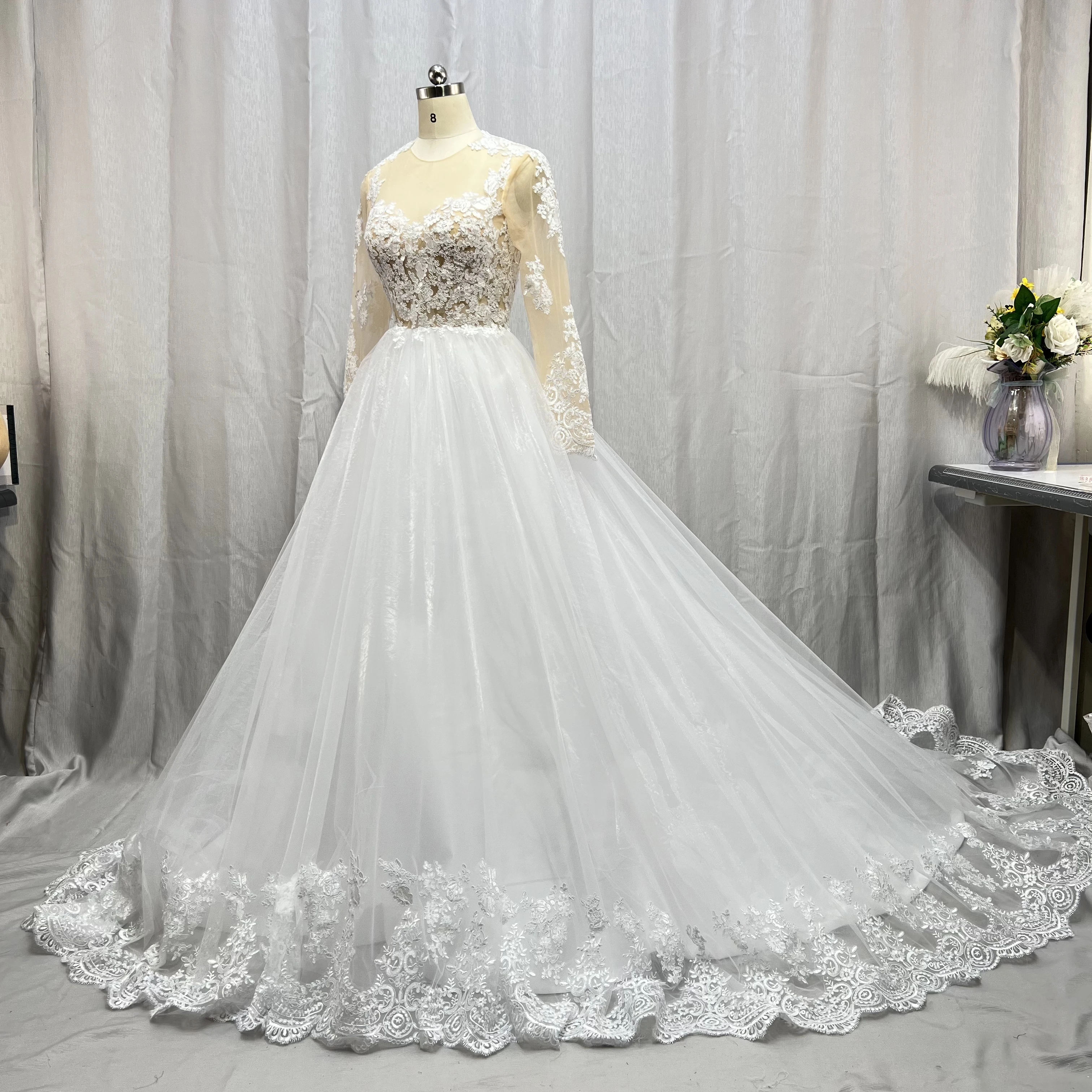 Свадебное платье с длинным рукавом, круглым вырезом и аппликацией и...
