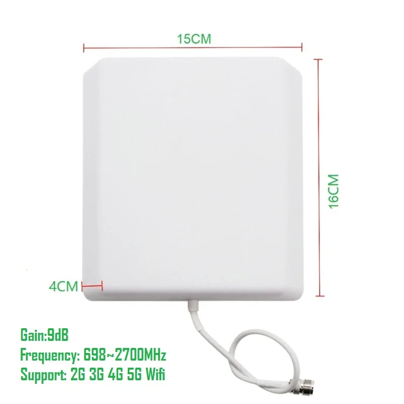 -Частотный диапазон: 698 ~ 2700 МГц;-Для бустера или маршрутизатора: 2G,3G,4G,5G,wifi-Коэффициент усиления: 7 ~ 10 дБи-VSWR: <2,5-Independance: 50-Разъем: N Female-Кабель: 0,3 метр-Размеры:22*18*7 см (мини)