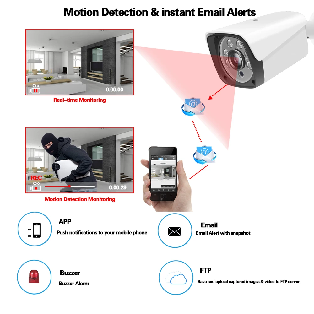 Эта система предназначена для отправки оповещения по электронной почте при обнаружении любого движения и позволяет записывать только при обнаружении движения.Можно настроить область, которую вы хотите контролировать, когда она срабатывает, она отправит сообщение на вашу электронную почту, вы можете получить информацию из первых рук, независимо от того, где и когда вы находитесь.