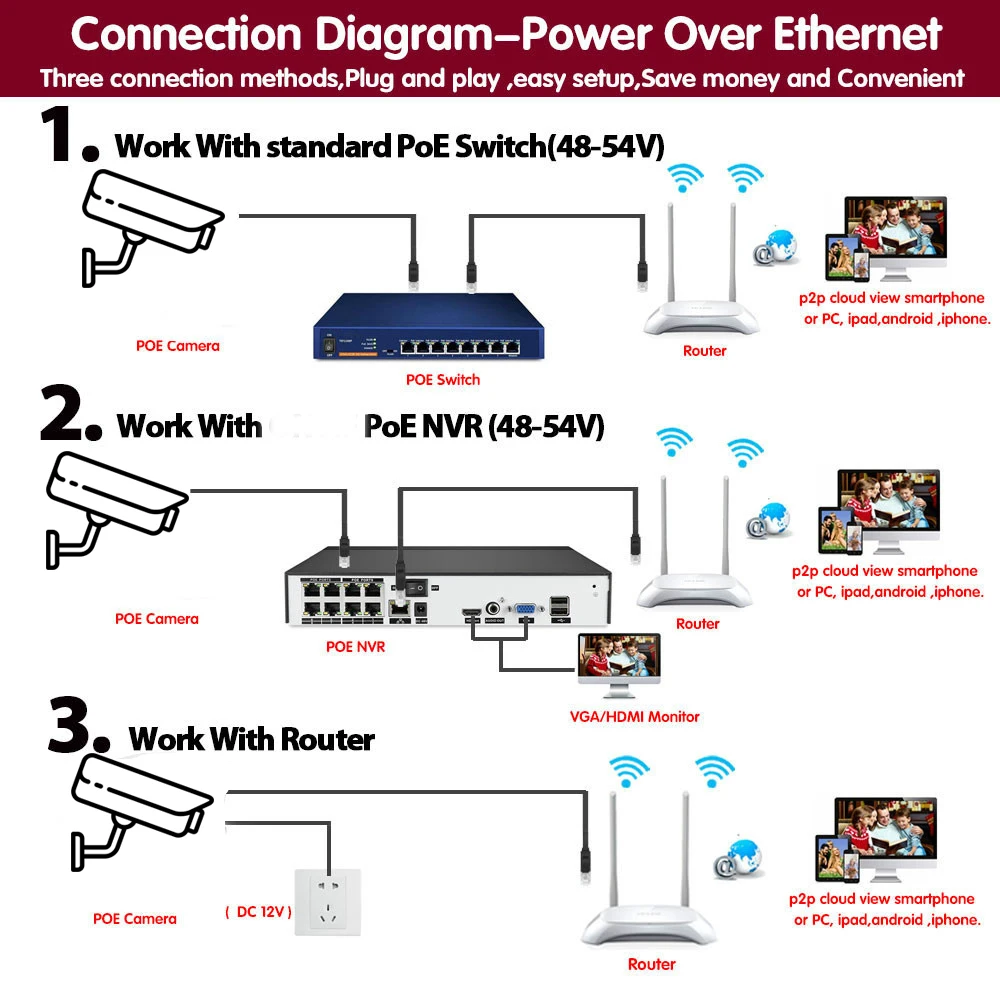 Простая настройка, всего 4 шага для Мобильный телефон просмотра,Просматривайте видео в реальном времени с системы из любого места и в любое время с помощью смартфона, стола или ПК с передовой технологией P2P, вы можете удаленно получить доступ к вашей системе за считанные минуты или меньше, пересылка не требуется, удаленный доступ никогда не был таким простым!