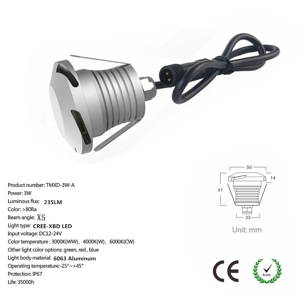 Мощность: 3 ВтЛюмен: 235 лмВходное напряжение: DC12V-24VСветильник Angele: 5 излучающих отверстийКласс защиты: IP 67Основной материал: алюминийРазмер корпуса: D50 X H41mm, D35mm cutРабочая температура: -25 °C ~ + 45 °CГарантия: 3 года с CE и ROHS, срок службы чипа 35 000 часовЦветовая температура: теплый белый (2700-3000K), натуральный белый (4000-4500K), холодный белый (6000-6500K) другие варианты: красный, зеленый, синийИспользование: входный светильник, дорожный боковой светильник, лестничный светильник, напольный светильник, светильник Conner и другой наружный светильник Venus