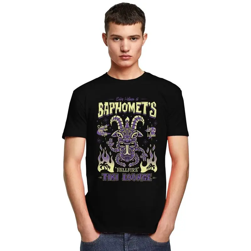 Мужской Бафомет футболка хлопковая футболка с коротким рукавом в стиле Харадзюку; Дизайнерская, Адского Пламени тики лаунж скрытую серфинг детская одежда, футболки