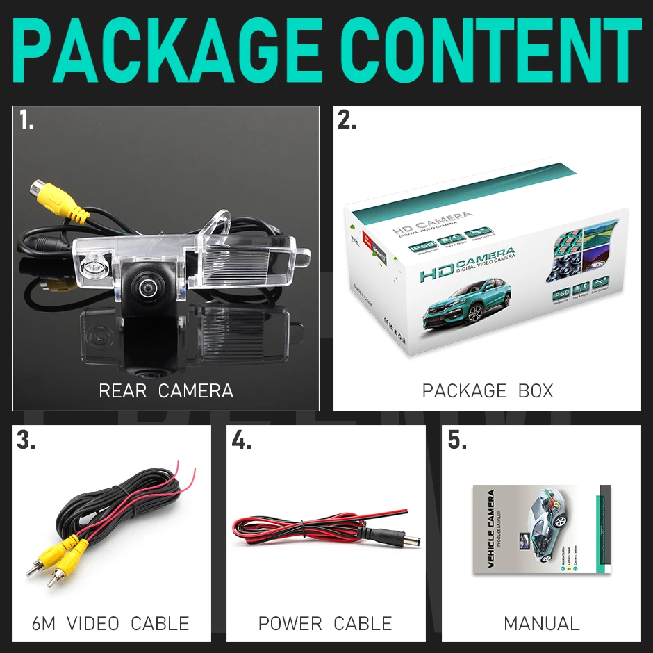 1. Камера заднего вида2 посылка вочная коробка3. Видеокабель (6 м)4. Кабель питания5. Руководство пользователя