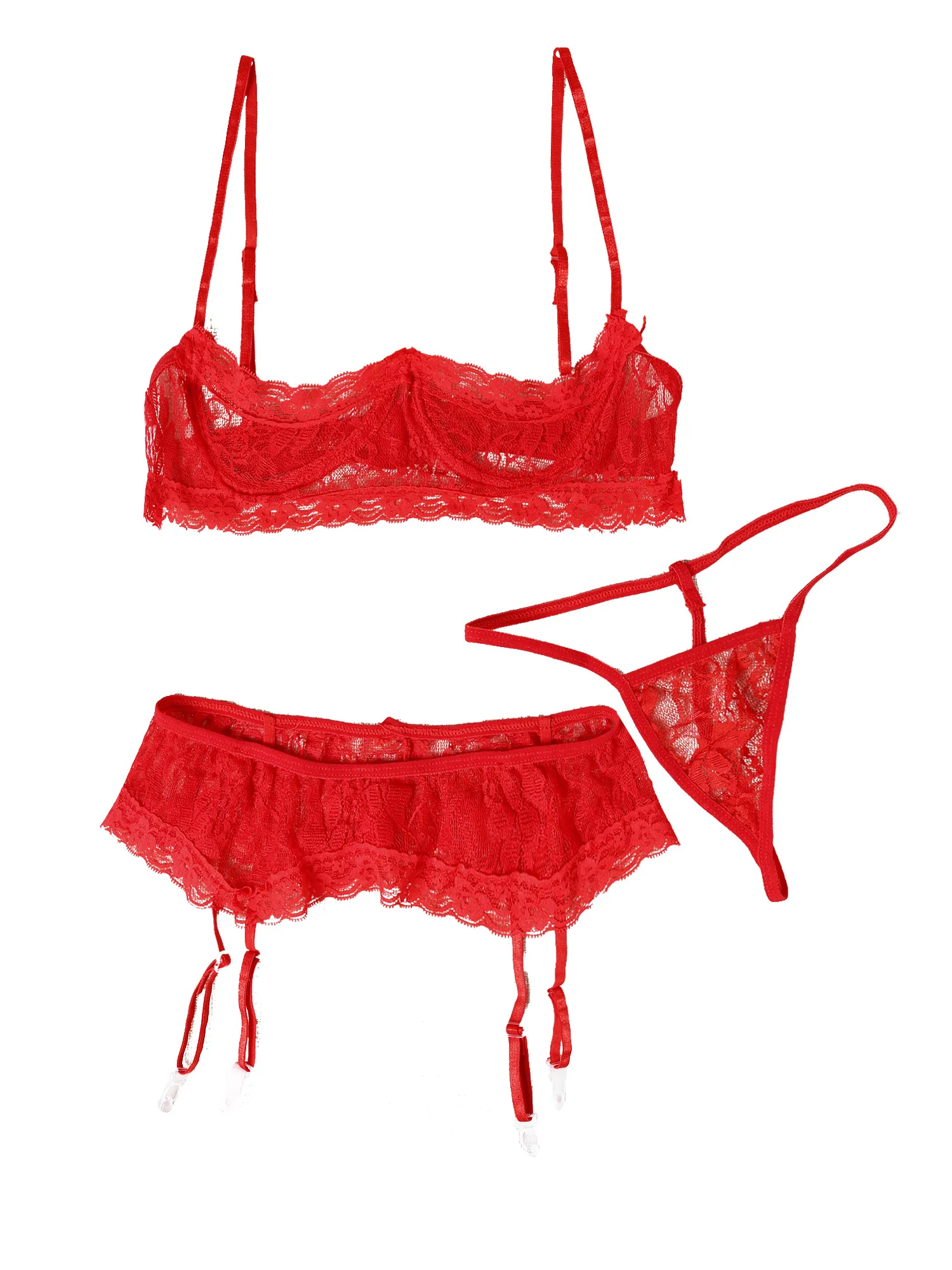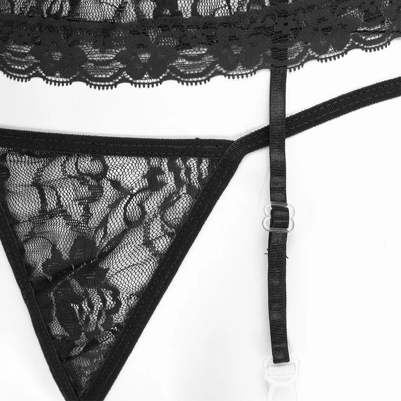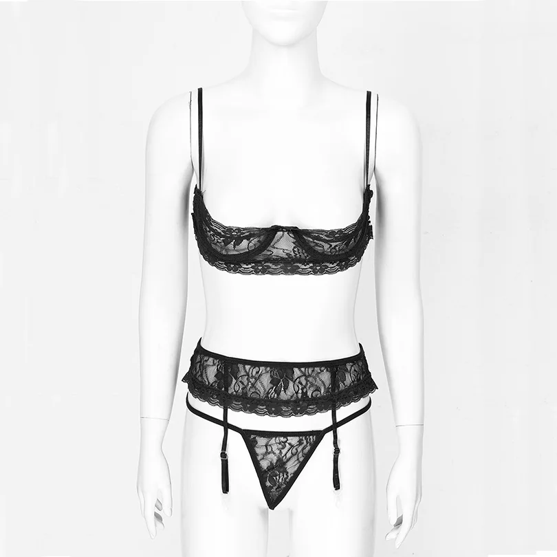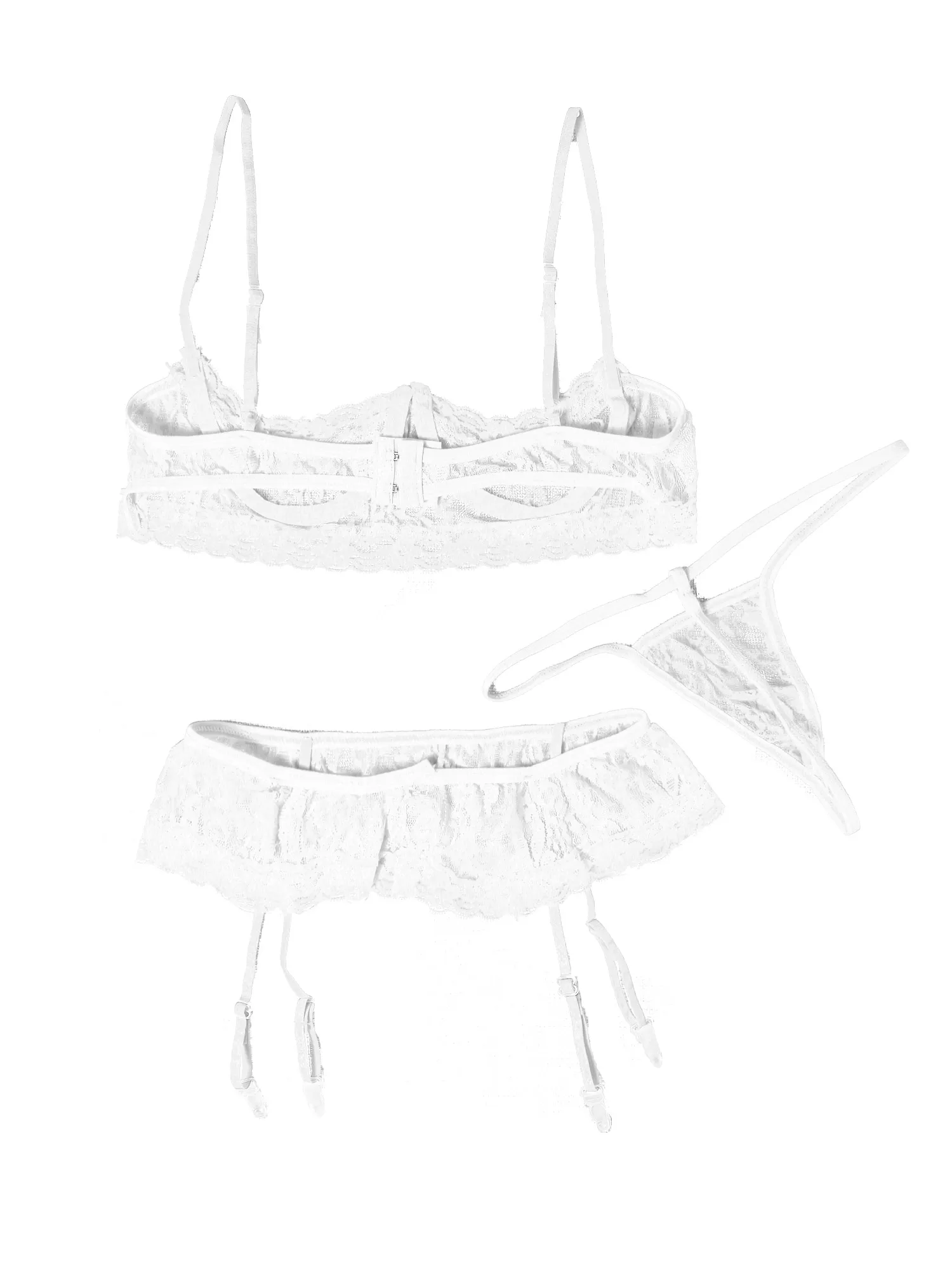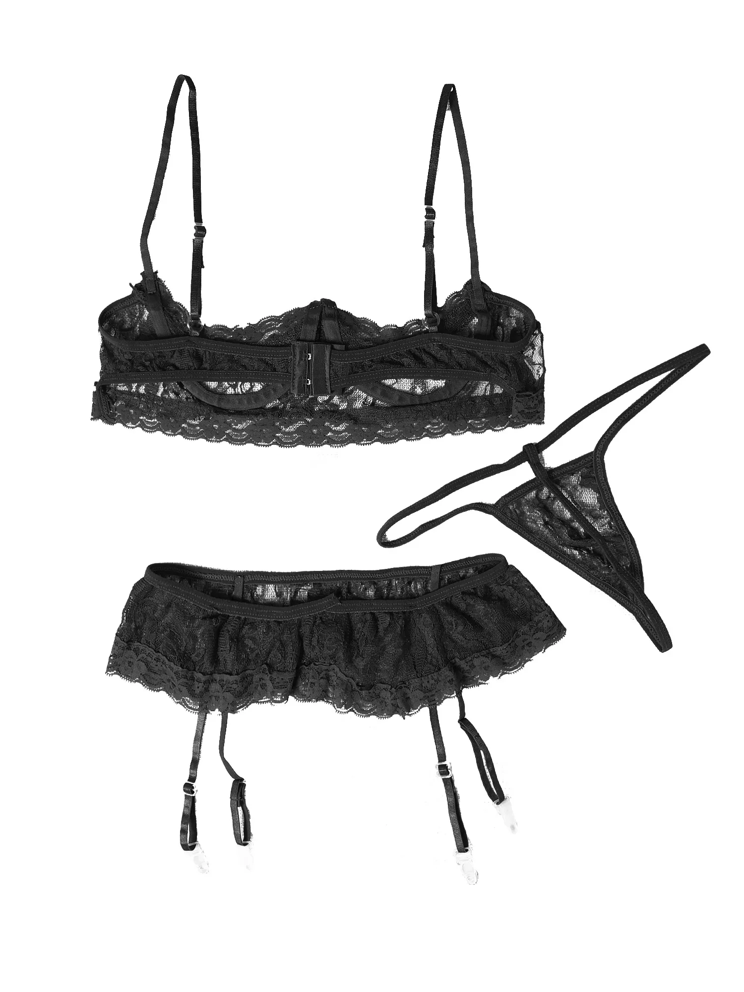 Женское нижнее белье из трех предметов, костюм, нижнее белье, прозрачный кружевной бюстгальтер на косточках с открытой чашкой и стрингами, пояса для чулок, экзотические комплекты