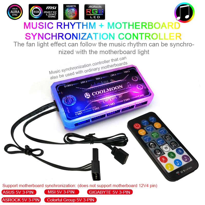 Вентилятор необходимо использовать с контроллером бренда. Есть 10 портов вентилятора и 2 светодиодных (светильник вая полоса) порта. Вы можете регулировать скорость, регулировать яркость, поддерживать Монохромное дыхание, многоцветное дыхание, быстрое медленное мигание, выделение, дыхсветильник и другие режимы световых эффектов. Светильник можно выключить, цвет можно менять автоматически, такой красочный! [Помимо функций обычного контроллера, музыкальный контроллер также может контролировать светильник вой эффект вентилятора, следя за ритмом внешней музыки, и поддерживать синхронизацию основной платы. Суперрежим с несколькими световыми эффектами, прохладный и долговечный, мощная функция]
