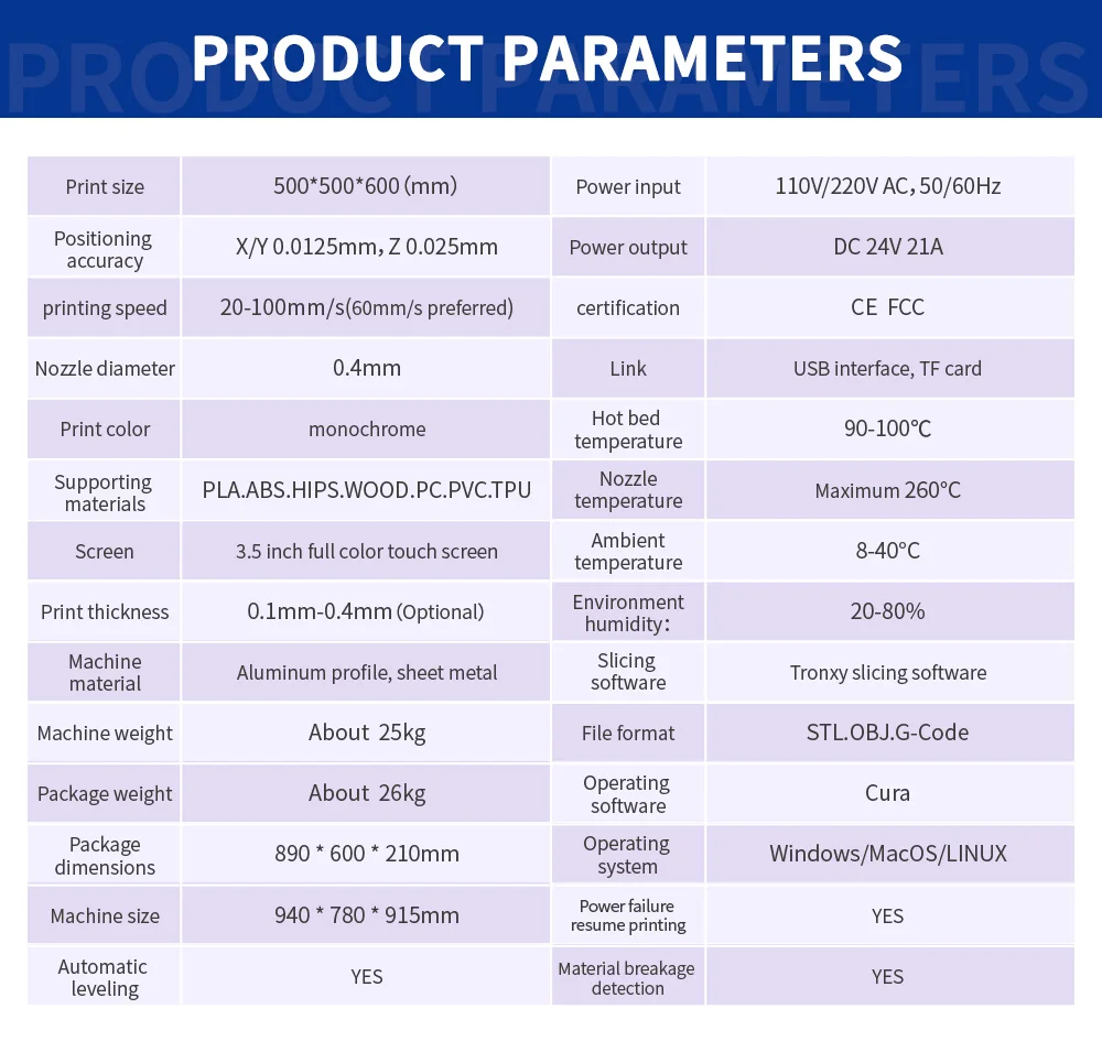 Размер печатной модели: 500 мм * 500 мм * 600 мм