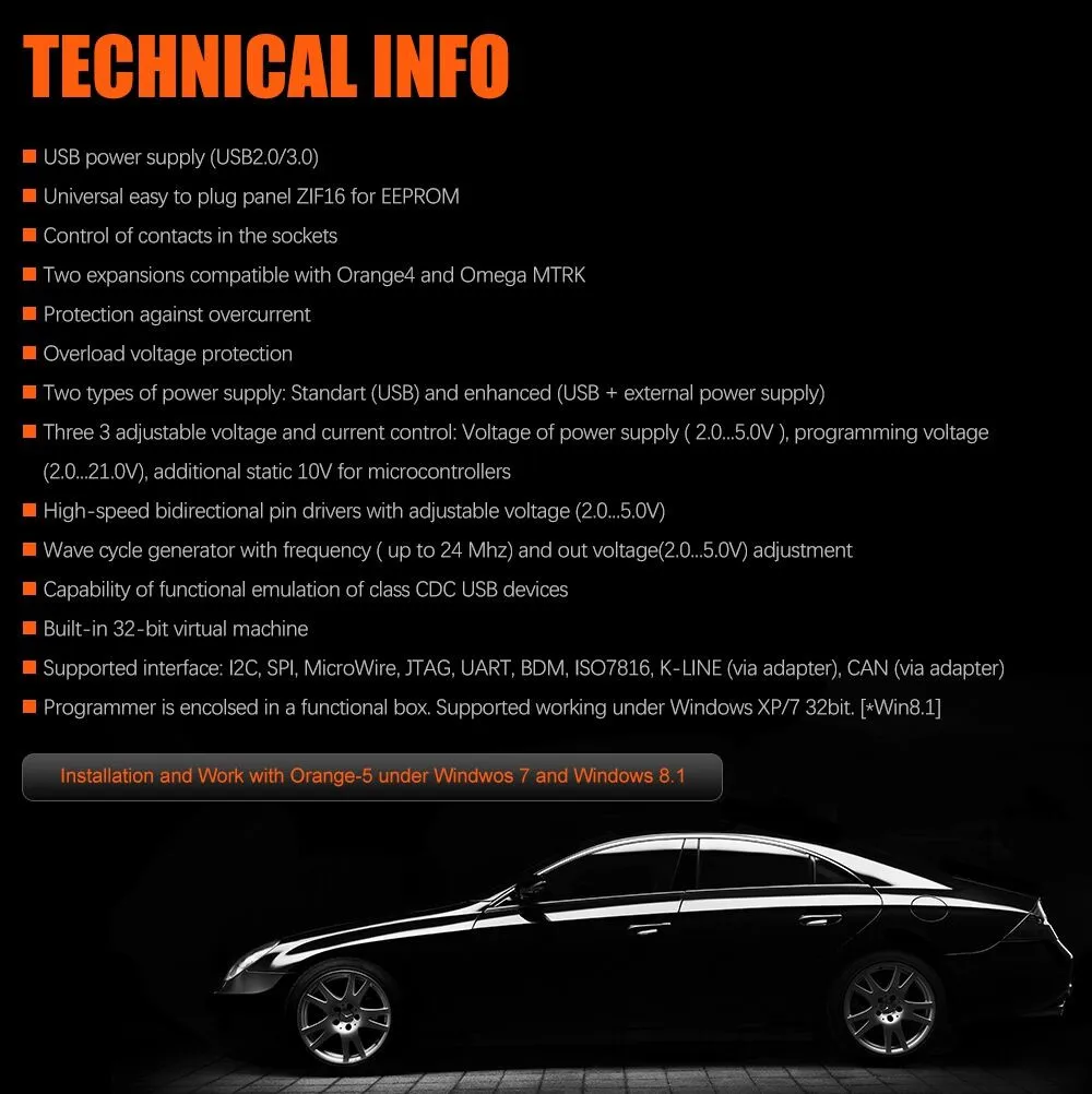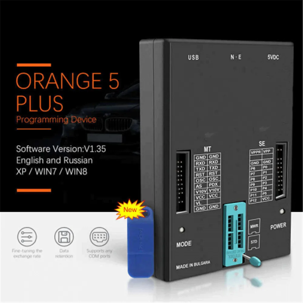 Orange5 Plus V1.35 Универсальный программист с полным адаптером улучшенные функции с usb-ключомПримечание:1. Версия программного обеспечения: V1.35, не поддерживает обновление.2. С usb-ключом в посылка, хорошее качество и стабильная работа3. Язык: английский, русский и китайский4. Операционные системы: XP WIN7Лицензия на программное обеспечение Orange5 Plus:MTRK (входит в оранжевый-5 основание)TMS (входит в оранжевый-5 основание)M08V НовыйImmo HPX 9V0NEC V850ES/SJ3 V850ES/SG3 UARTТехническая информация Orange5 Plus:* Источник питания USB (USB2.0/3,0)* Универсальная легко Подключаемая панель ZIF16 для EEPROM* Контроль контактов в розетках* Два расширения совместимы с Orange4 и Omega MTRK* Защита от перегрузки по току* Защита от перенапряжения* Два типа источника питания: стандартный (USB) и улучшенный (USB + внешний источник питания)* Три 3 регулируемых напряжения и контроля тока: напряжение источника питания (2,0... 5,0 V), программируемое напряжение (2,0... 21,0 V), дополнительный статический 10V для микроконтроллеров* Высокоскоростные двунаправленный pin драйверы с регулируемым напряжением (2,0... 5,0 V)* Волна цикл генератор с частотой (до 24 МГц) и напряжение на выходе (2,0... 5,0 V) Регулировка* Возможность функциональной эмуляции usb-устройств класса CDC* Встроенный 32-бит виртуальной машины* Поддерживаемый интерфейс: I2C, SPI, MicroWire, JTAG, UART, BDM, ISO7816, K-LINE (через адаптер), CAN (через адаптер)* Программист упакован в функциональную коробку. Поддерживается работа под Windows XP/7 32bit. [* Win8.1]-Установка и работа с Orange-5 под Windwos 7 и Windows 8,1CnCterm - Terminal программа для работы с COM-портами.