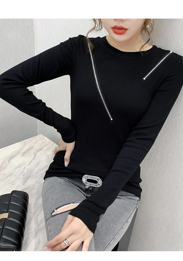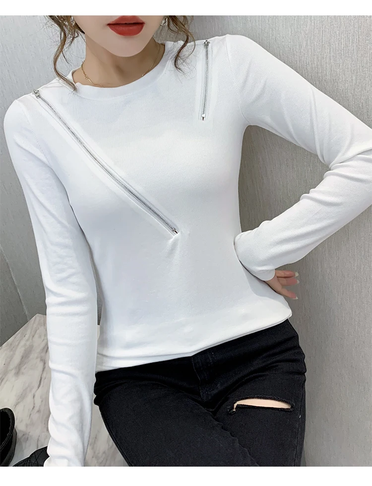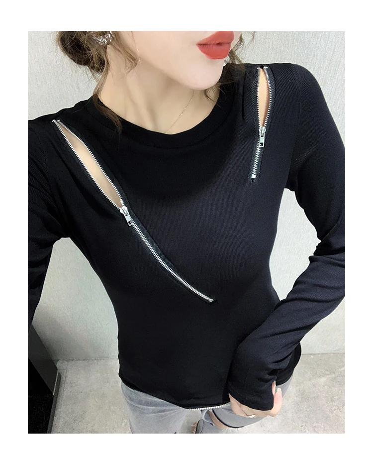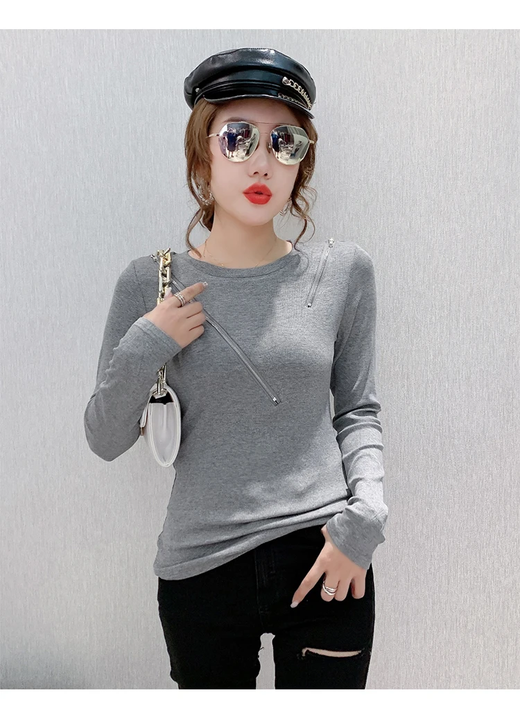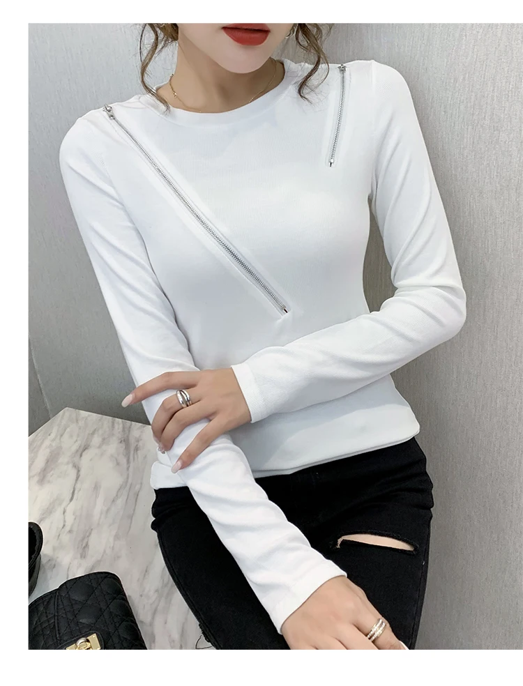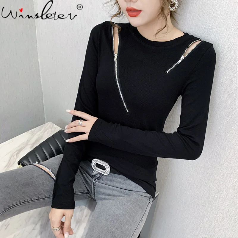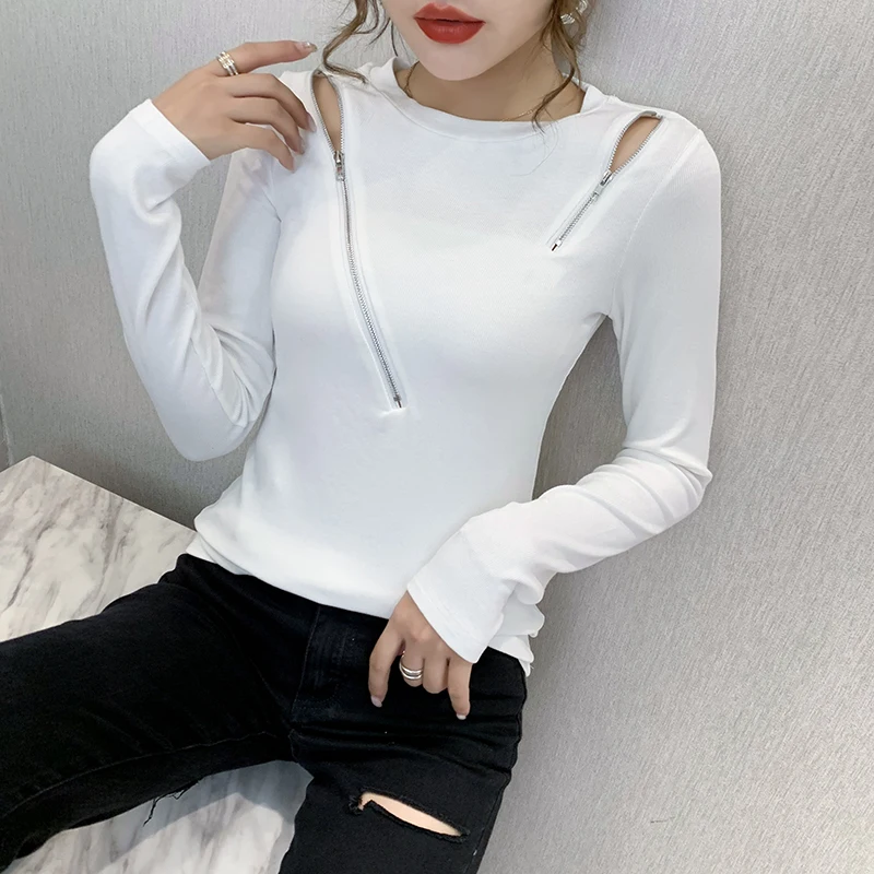Весенне-осенняя хлопковая футболка в Корейском стиле, модные сексуальные женские топы на молнии с открытыми плечами, облегающие футболки с длинным рукавом, 2021, T12803A