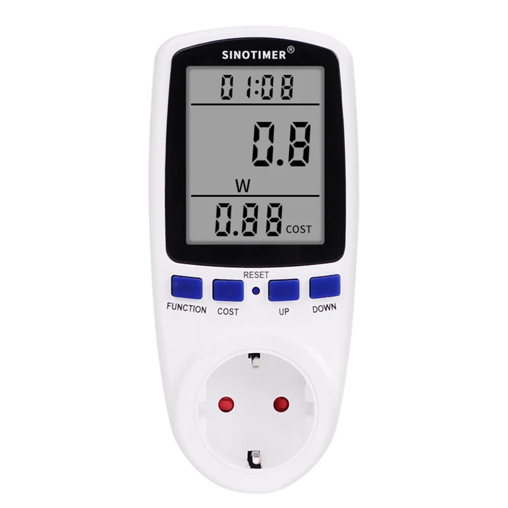 Измерение различных параметров + функция защиты от перегрузки: Мощность (Вт), энергия (кВтч), вольт, ампер, герц, коэффициент мощности и Максимальная мощность (Вт), время, дней (ваш заряд электричества в основном зависит от кВтч) большой прозрачный ЖК-экран легко читается.